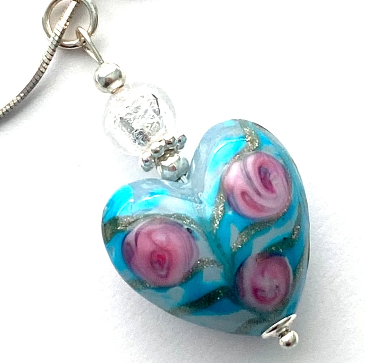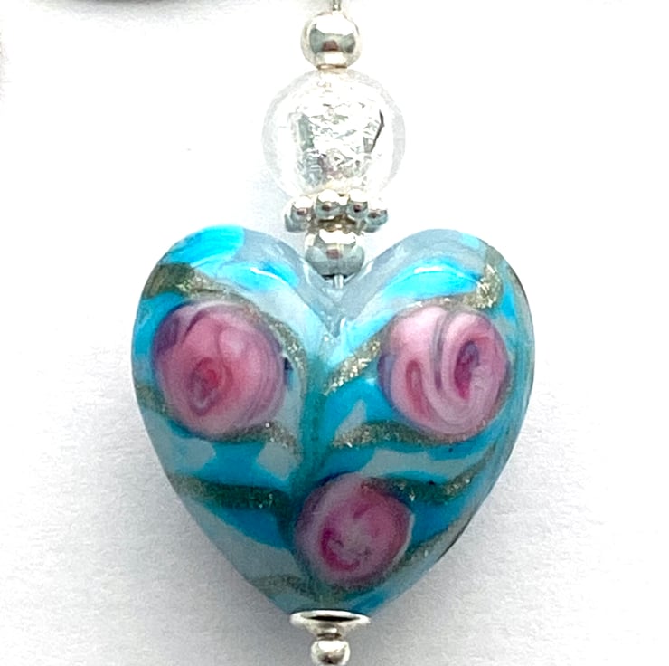 A gorgeous Murano Glass pendant with a blue aventurine Murano Glass heart (20mm) with pink roses and ribbons of gold and pure silver foiled Murano Glass round bead and sterling silver daisy spacer bead. The pendant hangs from a sterling silver chain (18inches) and is presented in a velvet gift pouch.
