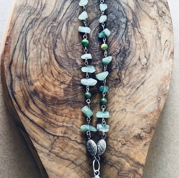 The necklace is made of green Aventurine crystals and faux Pearls.