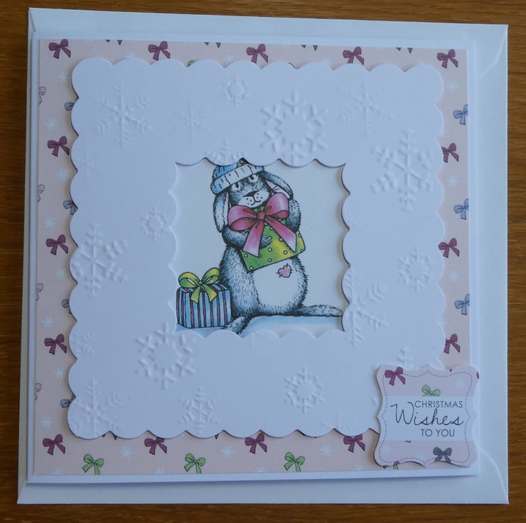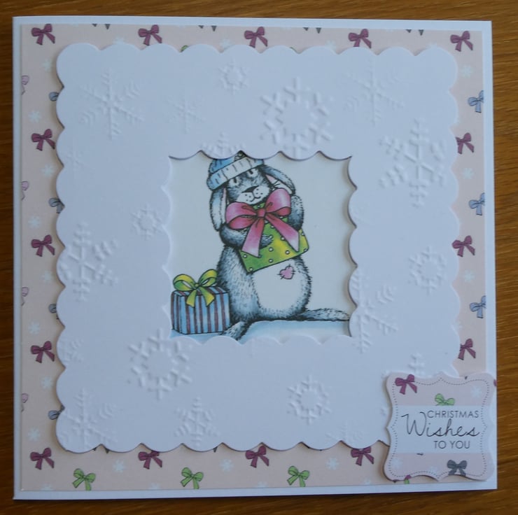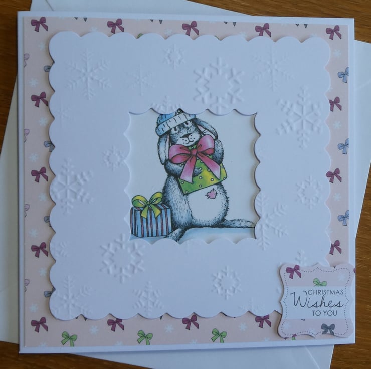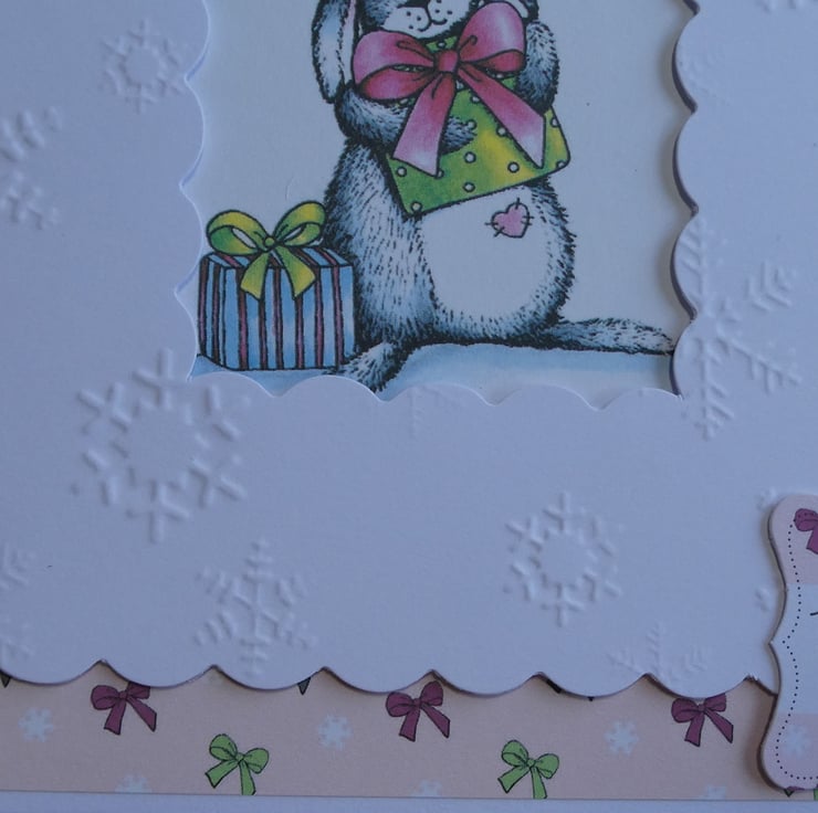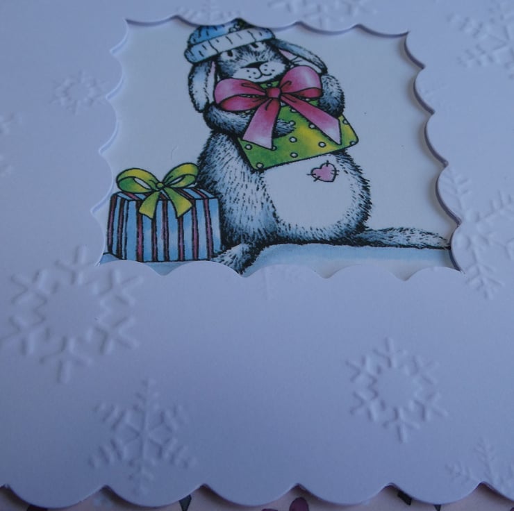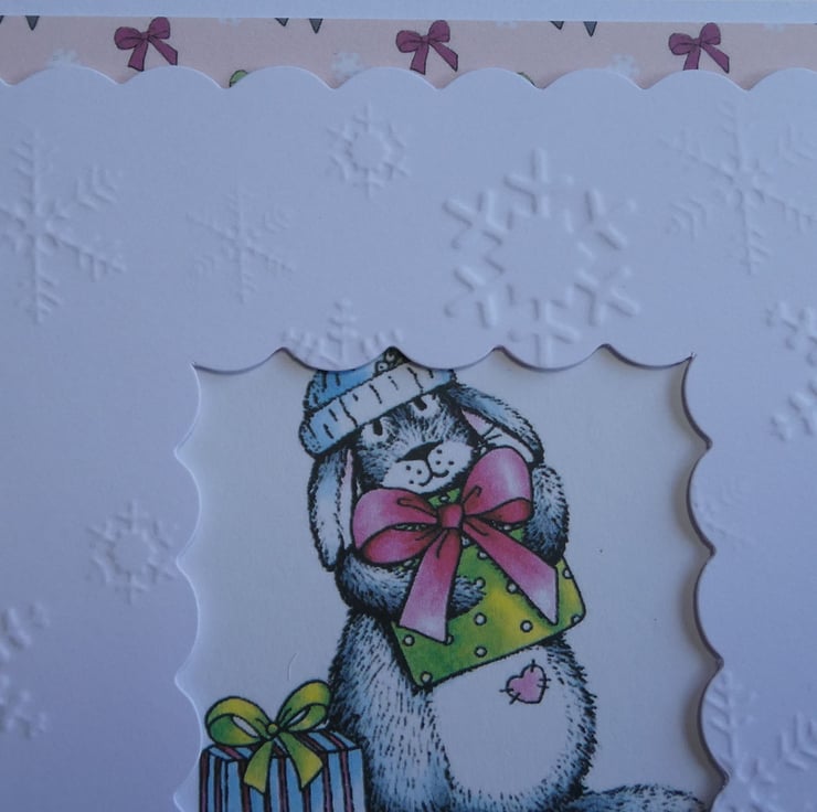 The central printed image shows a grey and white bunny with 2 presents. It has a pink heart on it's tummy and is wearing a blue and white woolly hat. The image has been mounted onto a background of pale pink paper decorated with bows and snowflakes and has been framed with a white scallop edged frame embossed with snowflakes.