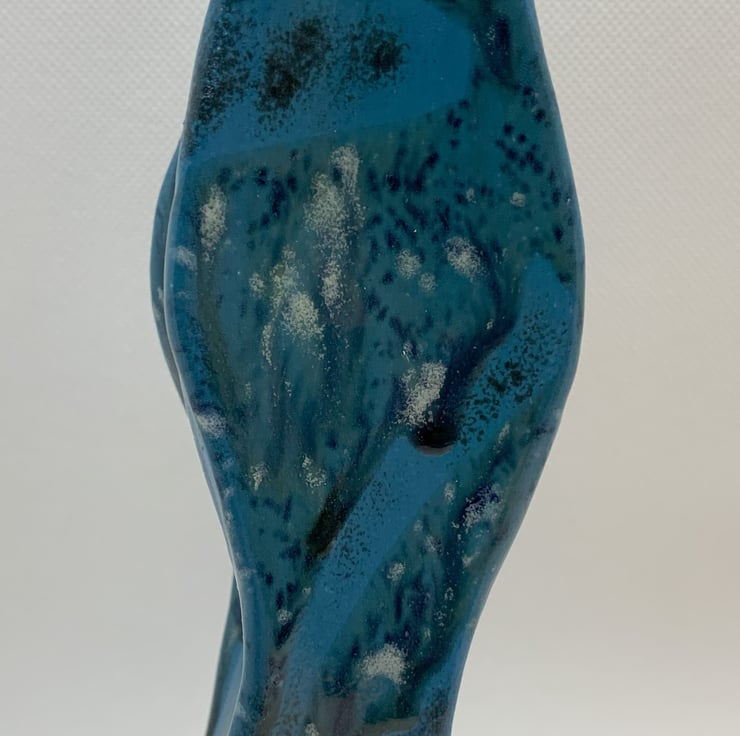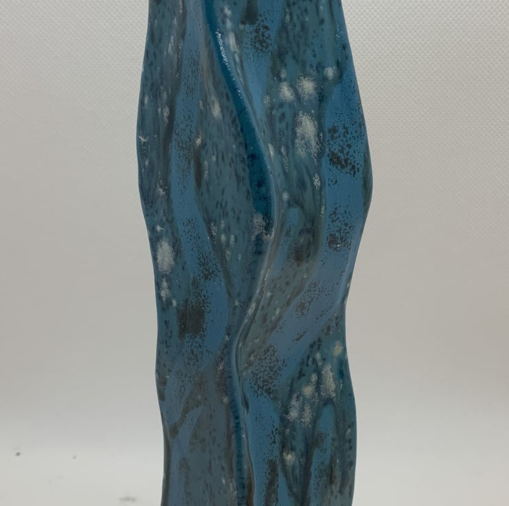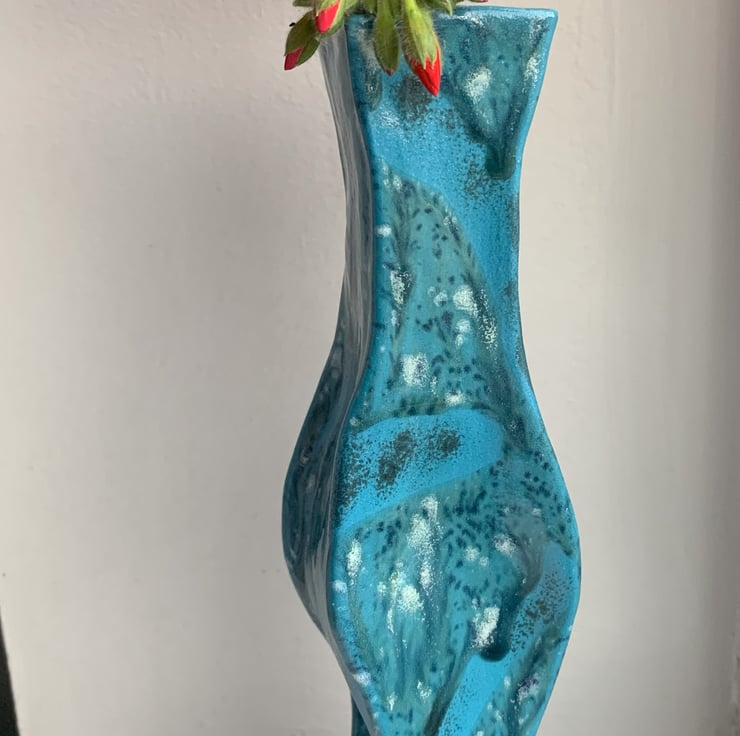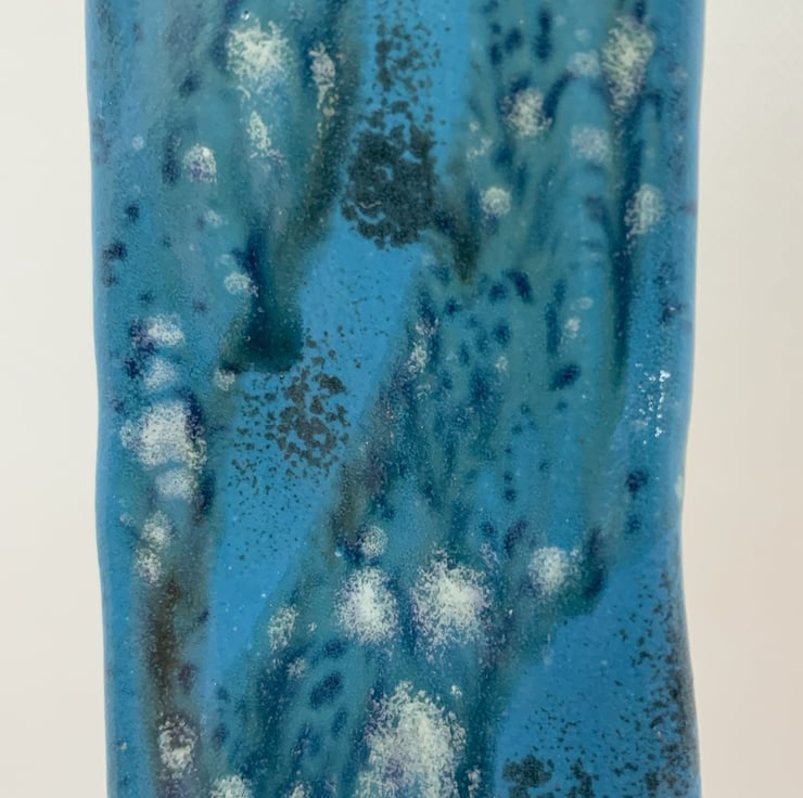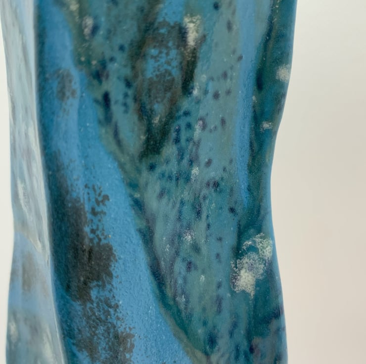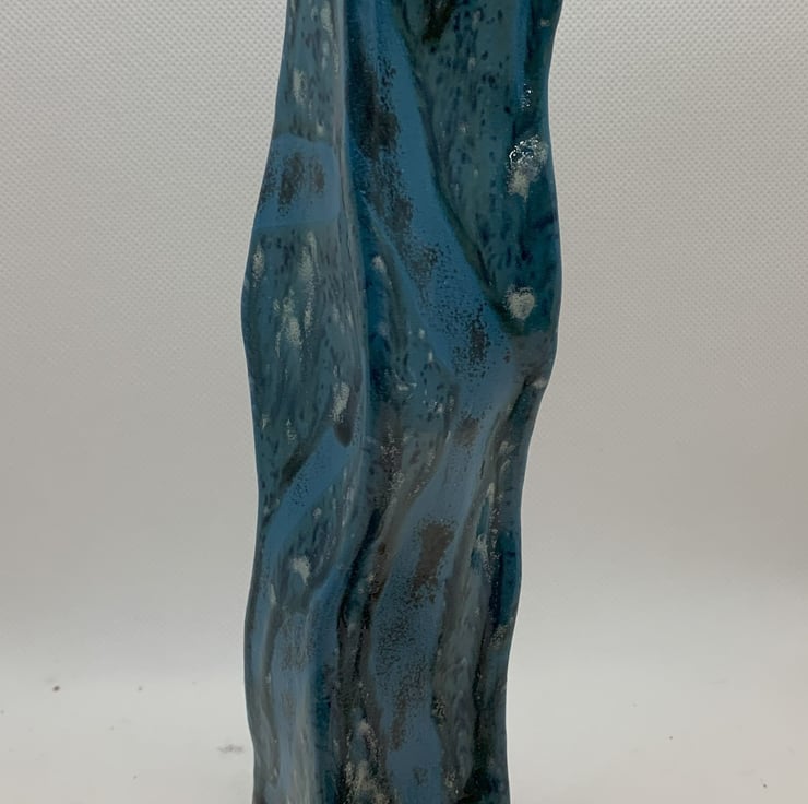 A delightful structural bud vase decorated with an abstract design. The vase has four sides rather than being round as is usual with vases. Handbuilt from a slab of clay and glazed with multi coloured blues and white. The vase is 9ins (23cms) high and at its widest 2ins (5cms).