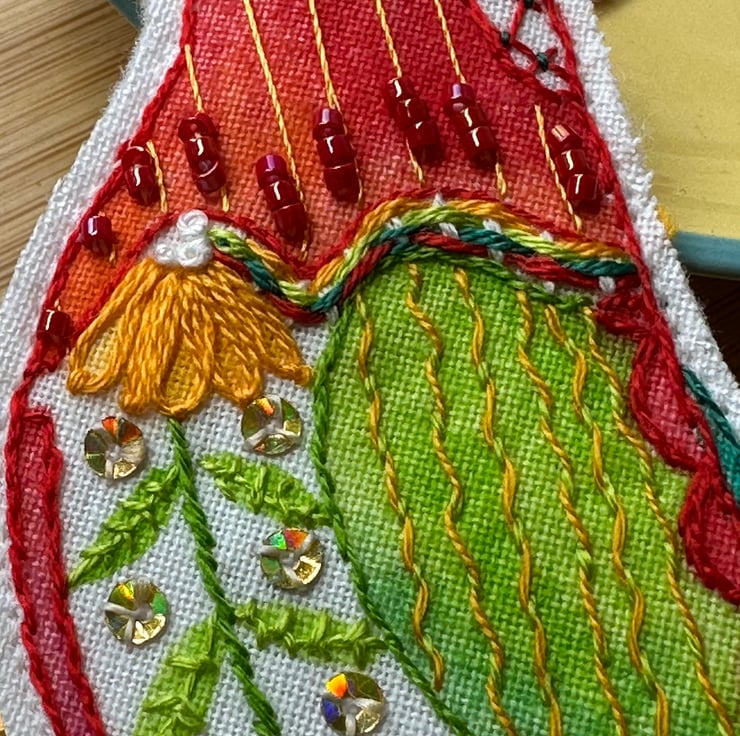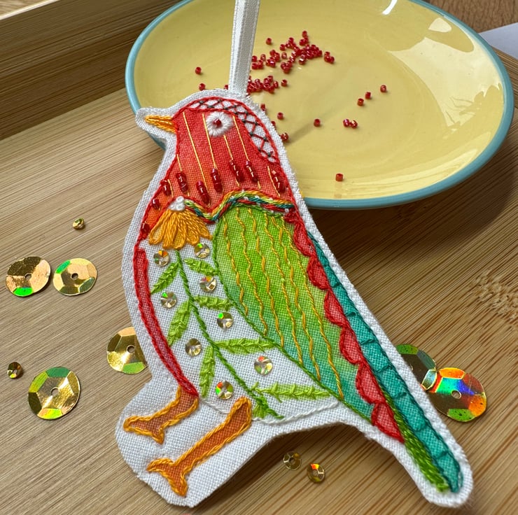 This Robin has been lovingly hand drawn onto cotton fabric, painted with inks and embroidered with stitch, beads and sequins to create a festive little friend for you to hang on your Christmas tree.