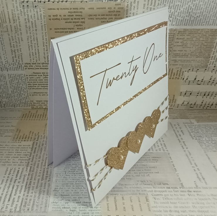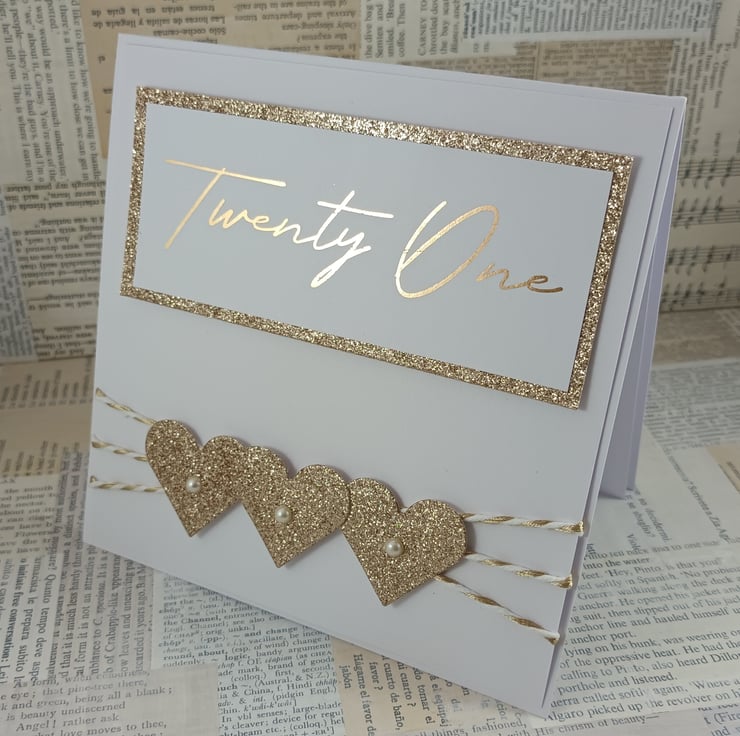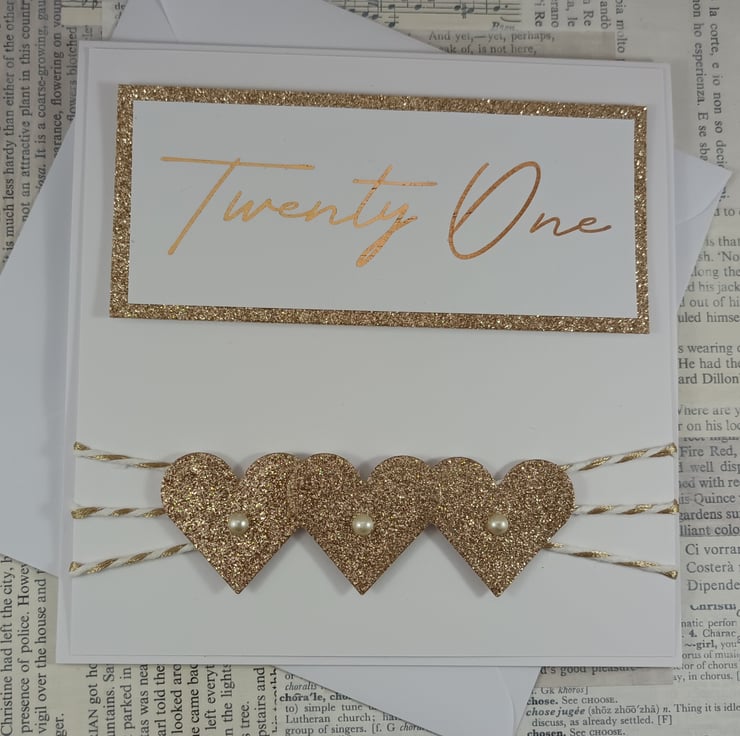 Square 21st birthday card in a tent folded style. The card features the text 'Twenty One' in rose gold foil on a white background which has been mounted onto matching rose gold glitter card. Below the text are three die cut hearts, each with a small faux pearl in the centre, overlaid onto lengths of gold and white twine.