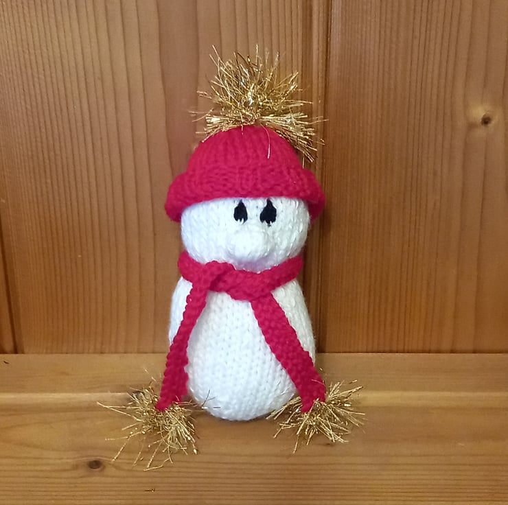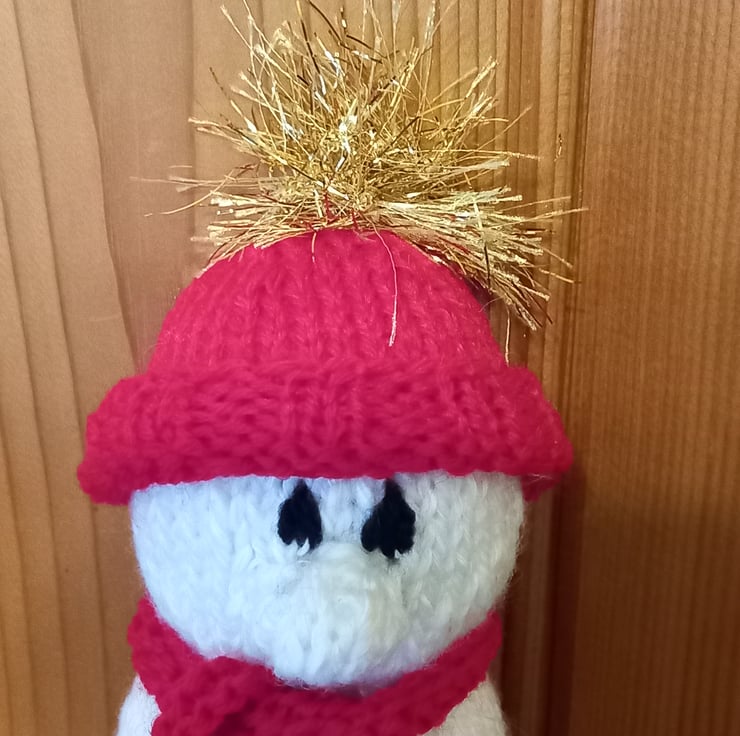 Hand knitted white Snowman finished with removable red scarf & hat & trimmed with tinsel wool.