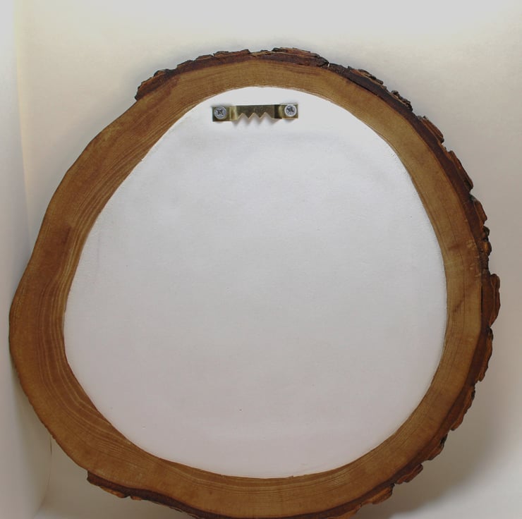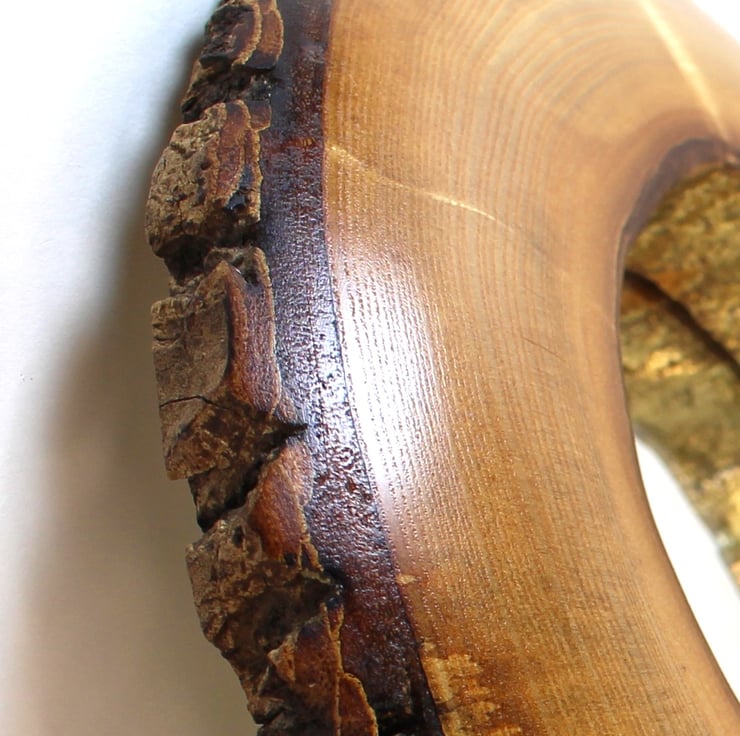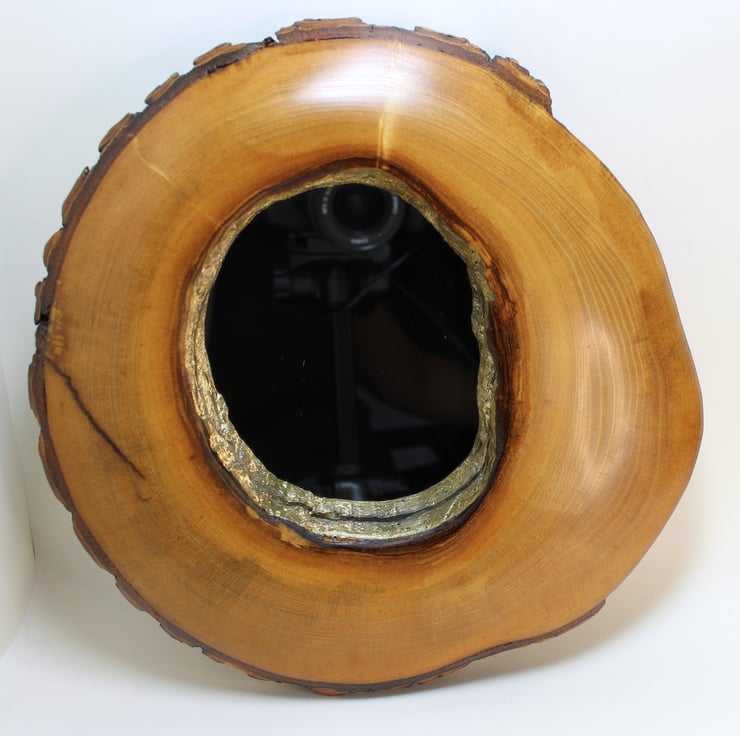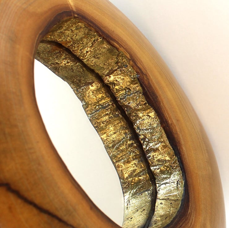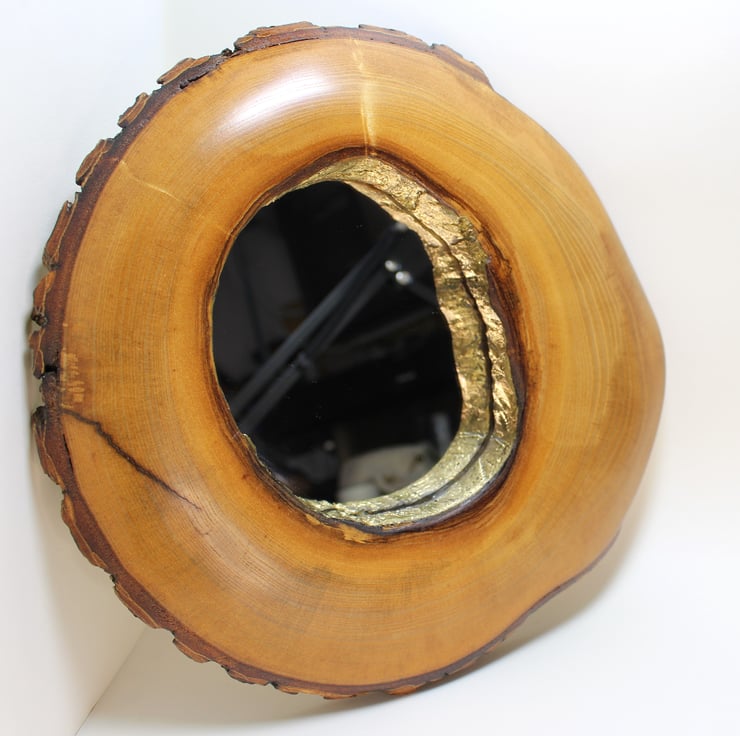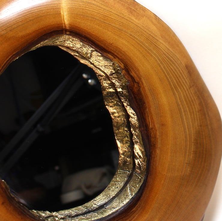 A delightful live edge wall mirror that has been backed with rubber foam to protect both the mirror and any wall that it is hung on. The walnut log that this was cut from had been eaten away on the inside. Leaving only a small section of the dark walnut heart wood remaining. The inside edge that is facing the mirror has been gilded with a mix of gold and brass leaf. The brass looks the same as the gold at the moment but will tarnish a nice sea foam green over time, unlike the gold.
