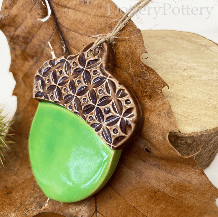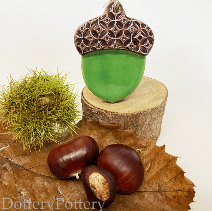 This little pottery acorn has been cut from white earthenware clay, decorated and fired. It has then been glazed with bright, glossy glazes and fired again to 1100 degrees. It hangs from a brown string. 5cm wide x 6cm high x 0.8cm deep. Suitable for indoor or outdoor use.