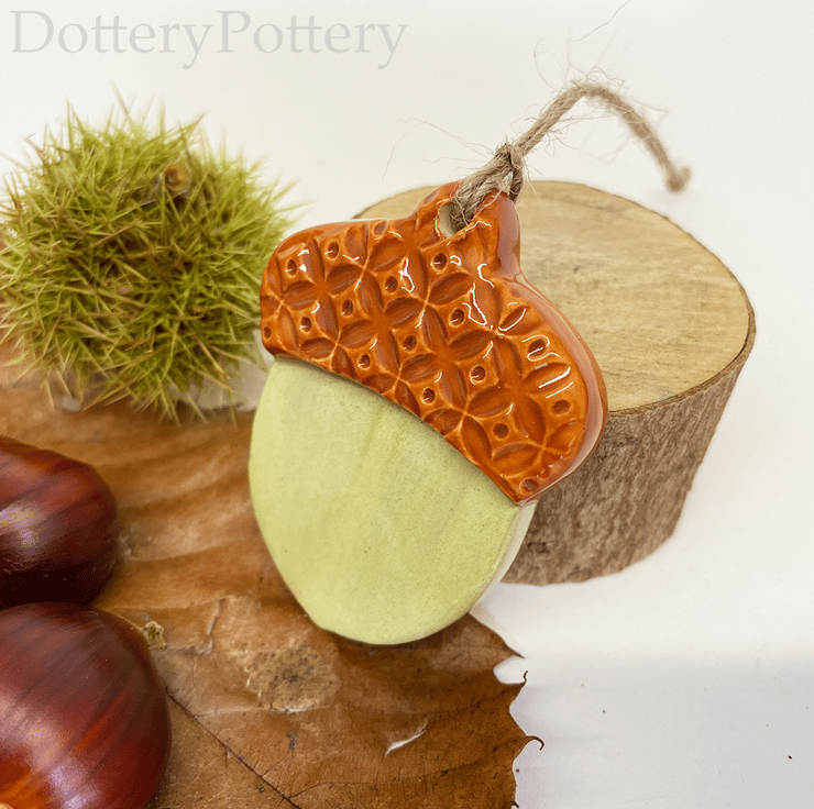 This little pottery acorn has been cut from white earthenware clay, decorated and fired. It has then been glazed with bright, glossy glazes and fired again to 1100 degrees. It hangs from a brown string. 5cm wide x 6cm high x 0.8cm deep. Suitable for indoor or outdoor use.