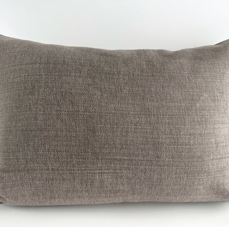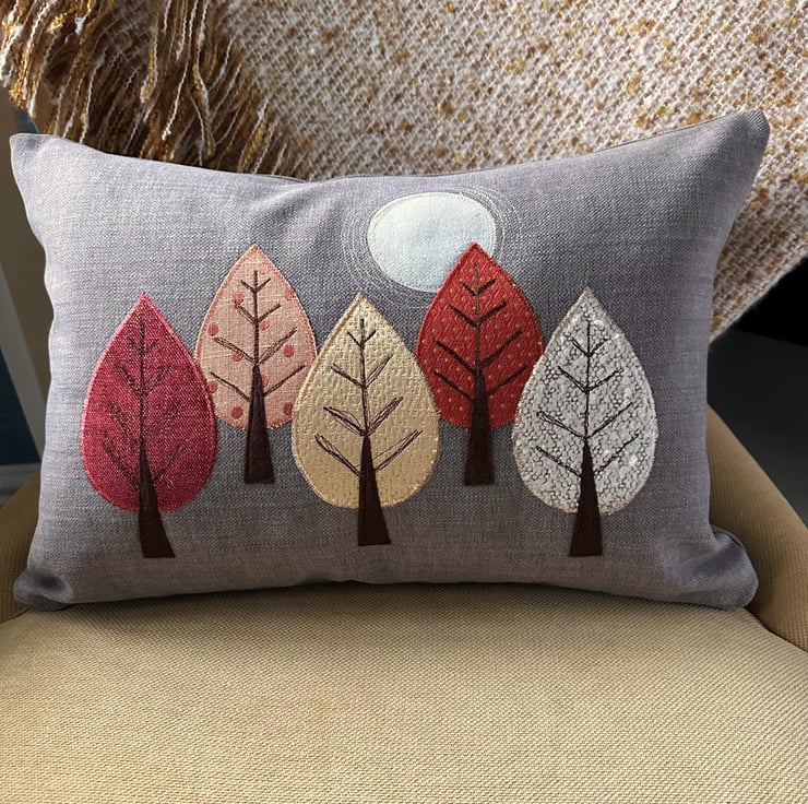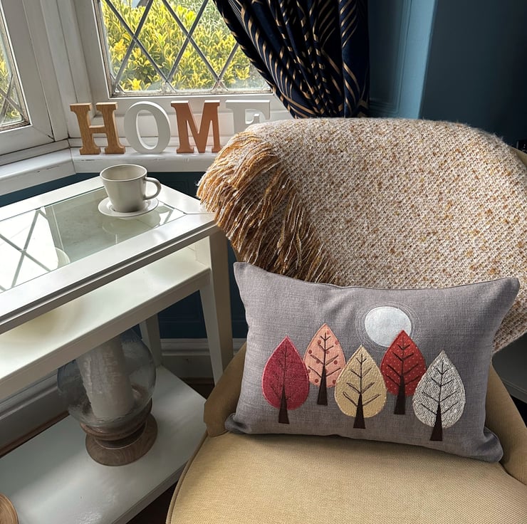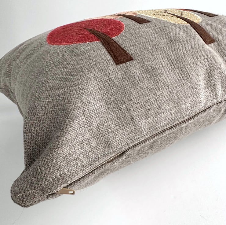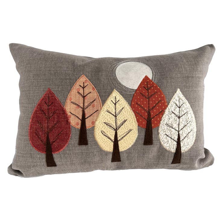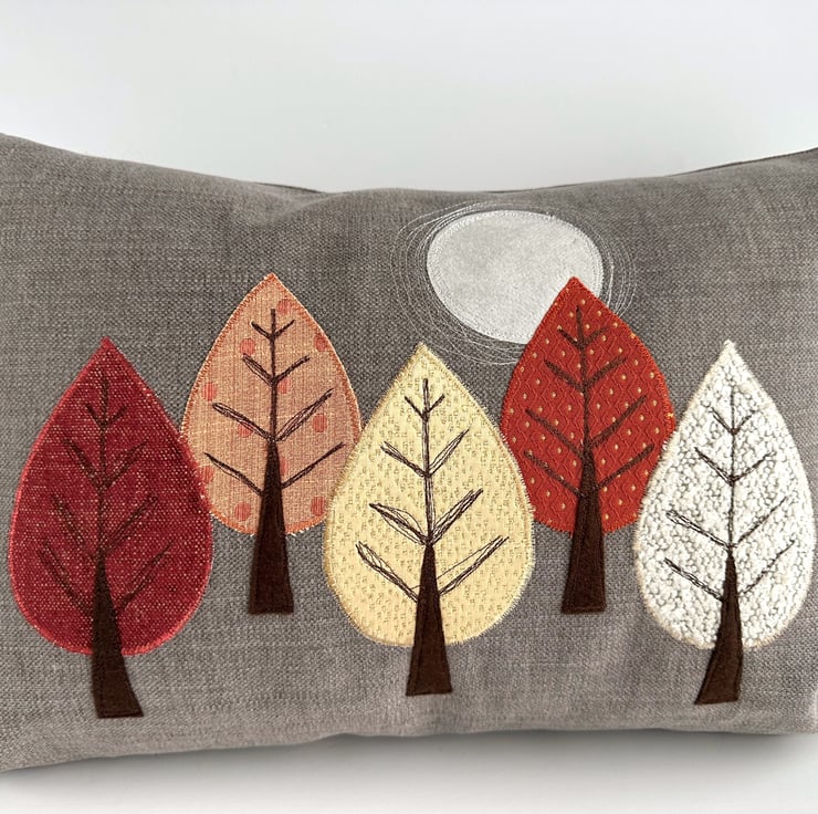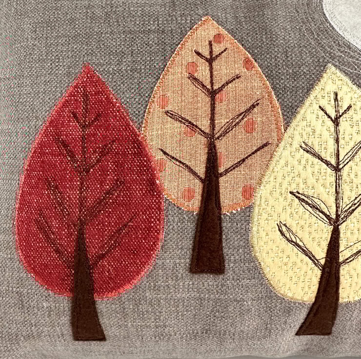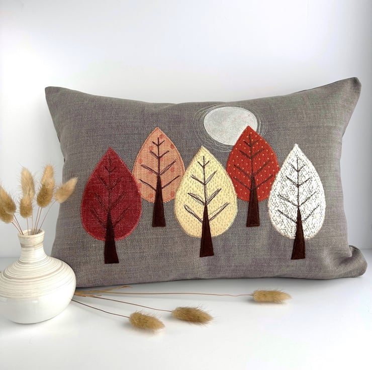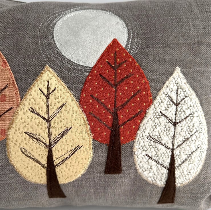 A rectangular cushion in taupe upholstery fabric with an appliqué scene depicting five trees under a full moon, in a naive art style. The trees are made from a variety of textured and subtly patterned fabrics in lovely autumnal shades of burgundy, peach, gold, burnt orange and cream. The trunks and branches are a combination of brown felt and free-motion embroidery. The moon is made from a pale ivory fabric with a slight sheen and is outlined with circles of free-motion embroidery. The cushion cover has a concealed zip along the bottom and comes with a polyester hollow fibre cushion pad which conforms to safety regulations.