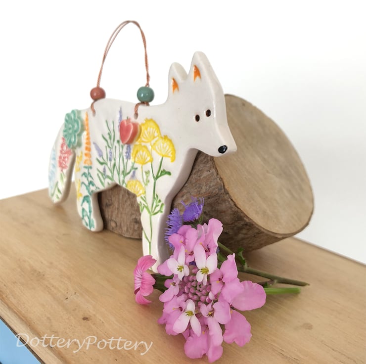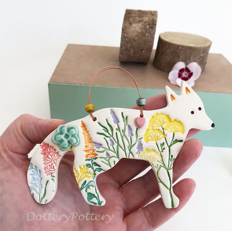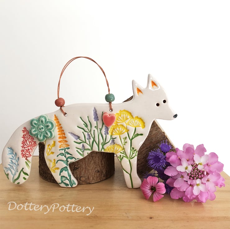 This fox decoration has been made from white earthenware clay and decorated with pattern and raised features. It has been fired twice and finished with a clear, glossy glaze. Glazed on the front only. It measures 12.5cm x 6cm x 1cm deep and hangs from a double stranded, twisted copper wire with ceramic beads.