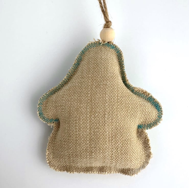 Mushroom fairy house hanging decoration. This delightful decorative toadstool house is made from golden beige upholstery fabric, with a pretty patchwork print fabric overlaid. The patchwork print fabric has floral and striped patterns in pretty shades of turquoise, duck-egg blue, peach, beige, cream and olive green. This has then been embellished with a natural wood button with the words “Handmade with love” and two tiny hearts inscribed on it. The mushroom house has an arch-shaped door in cream and beige striped fabric, and a square quartered window in cream and beige leafy fabric. The door is surrounded by a green machine-embroidered leaf pattern, to which I’ve added hand-embroidered French knot flowers in a pretty peach colour. The fairy house is finished with a natural wooden bead chimney and a jute hanging loop. The hanging decoration is lightly stuffed with polyester hollow fibre filling.