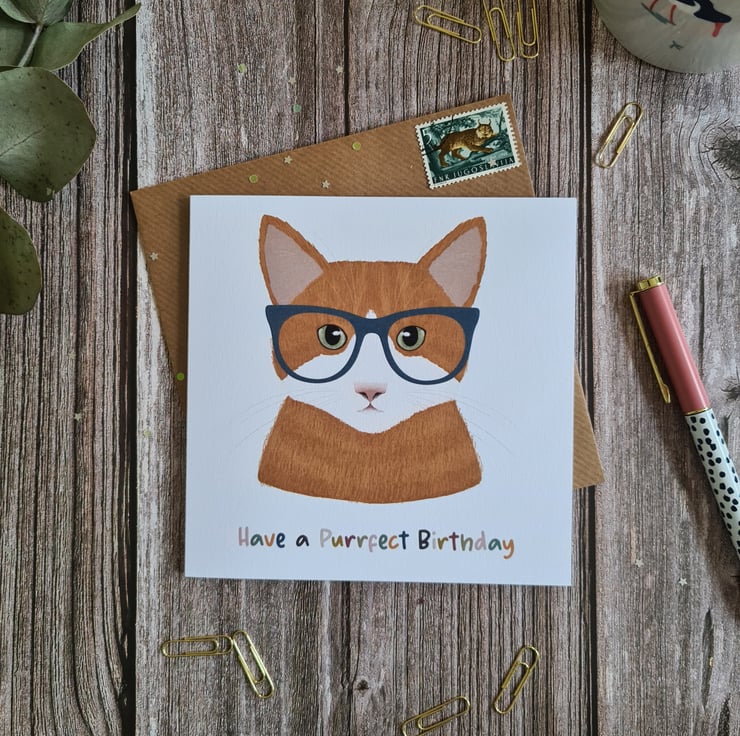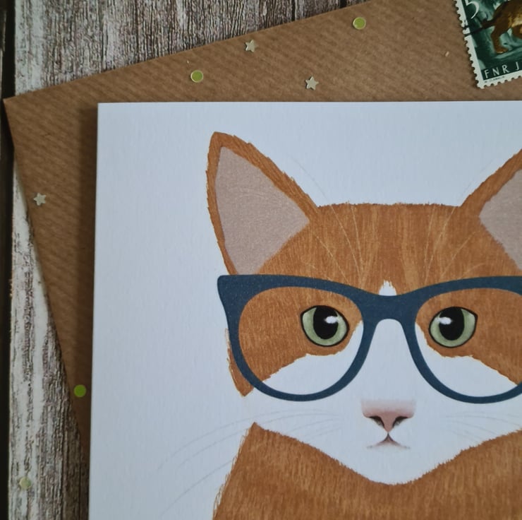 A beautiful illustrated 15cm x 15cm birthday card which will make anyone smile, who cant resist a cat wearing glasses! The card and the kraft envelope are both recyclable and comes protected in a plastic sleeve.