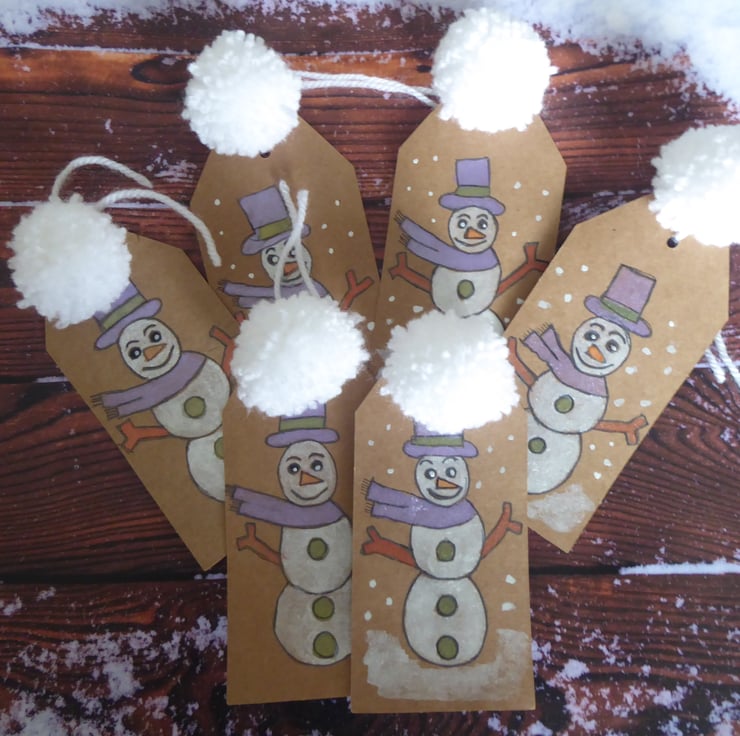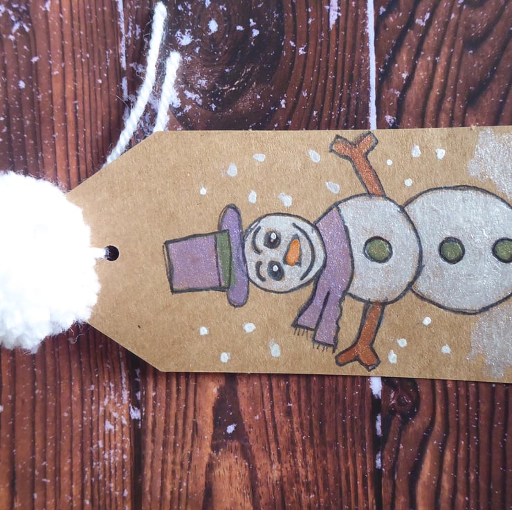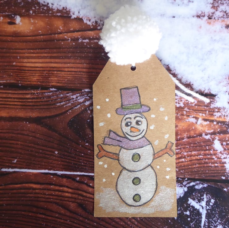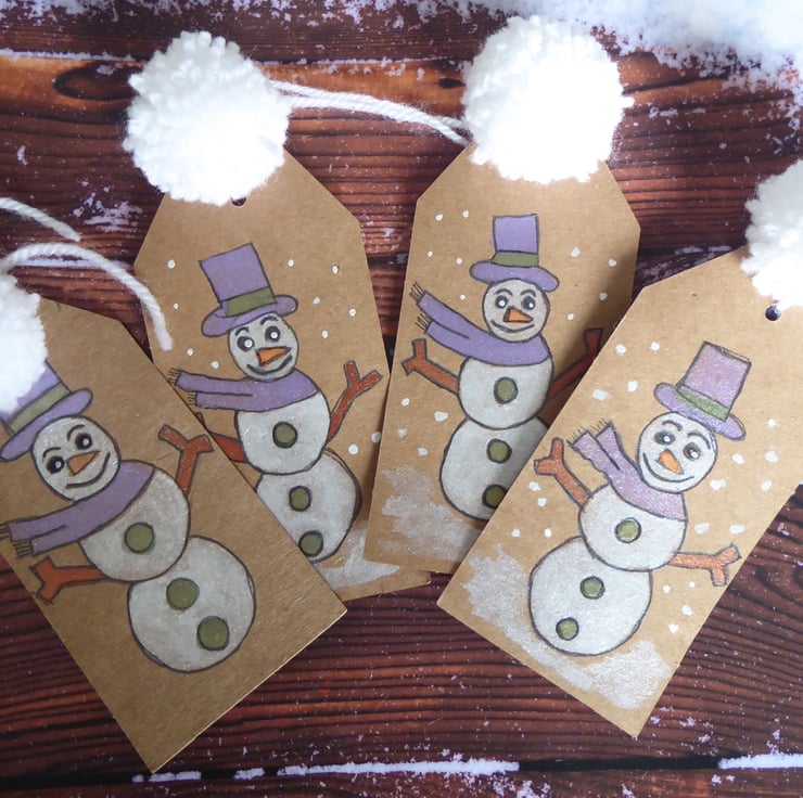 Set of shimmery metallic snowman gift tags. Individually hand painted with a cheerful winter snowman design, this time with a purple hat and scarf. Finished with a pom pom and all ready to attach to your gifts. Each tag is approximately 12cm high, and blank on the reverse for your own greetings.