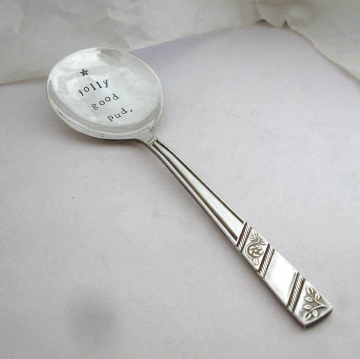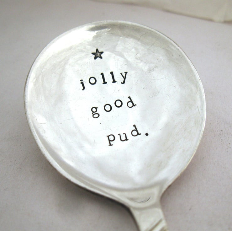 A jolly nice spoon for putting on the Christmas table for someone to eat their pud with. Because as we all know, there's no such thing as too much pud! It says 'jolly good pud' and has a little star on it.