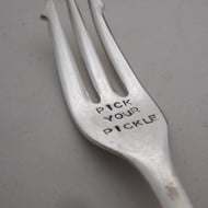 This listing is for ONE had stamped vintage fruit or dessertspoon approx. 5.5" (14cm) long. It has a round bowl and a floral handle with a rope twist detail (the pattern is 'Silver Rose' by Viners). You will receive the item shown in the photographs. The lettering is coloured black with a non-toxic, water-based acrylic ink. Not dishwasher proof so please wash carefully by hand. The lettering may still fade with time but the letters themselves are stamped into the metal so they won't go anywhere.