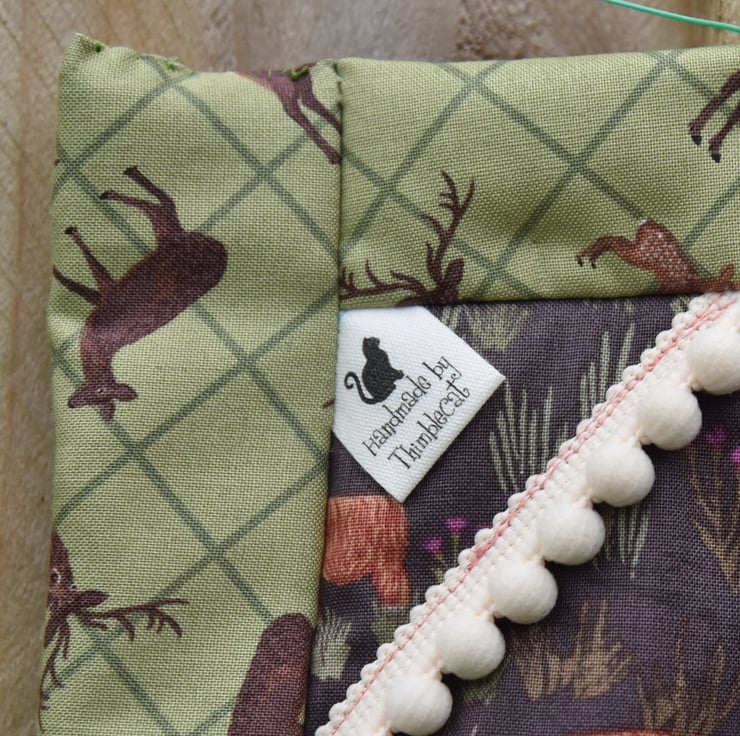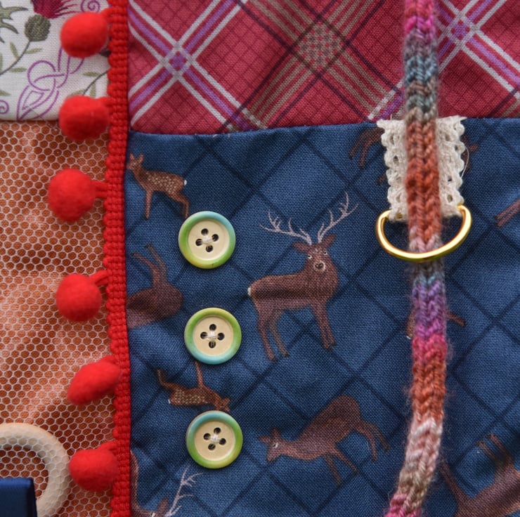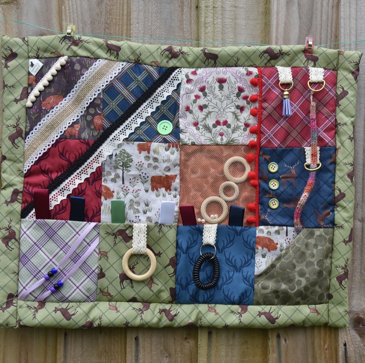 The twiddle mat consists of twelve 100% cotton patchwork squares in Scottish themes with highland cattle, thistles, stags and deer and tartans. It is bordered in a green, deer patterned fabric.