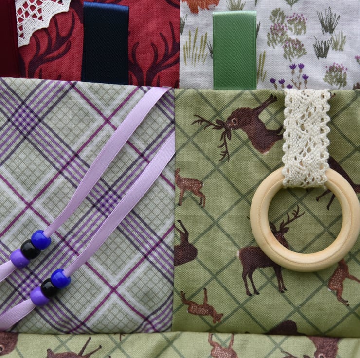 Activities include different textures, ribbons to pull at, buttons to feel, beads on ribbons to practice fine motor skills; a plastic and a wooden ring; leather tassel and French knitting to play with, wooden rings with beads behind netting for moving around, and a small plastic fiddle toy is concealed in a corner pocket.