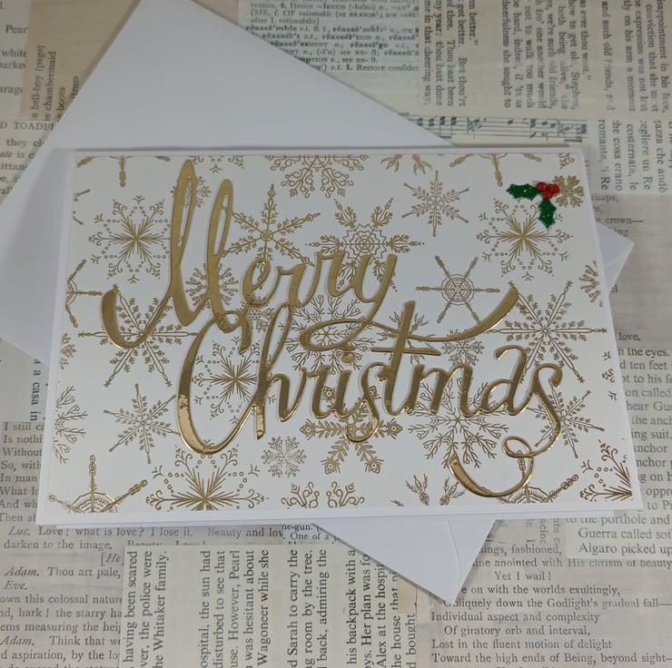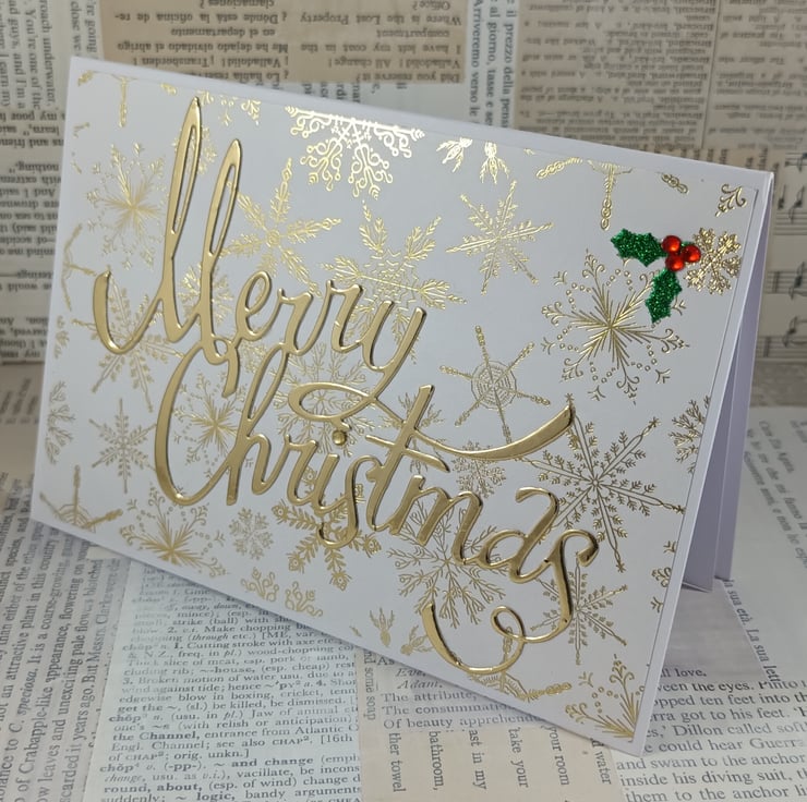 A6 landscape Christmas card featuring the phrase Merry Christmas cut from gold mirri card and on a gold foiled snowflake background. The card is embellished with a small sprig of holly. The message inside reads: 'Season's Greetings'.