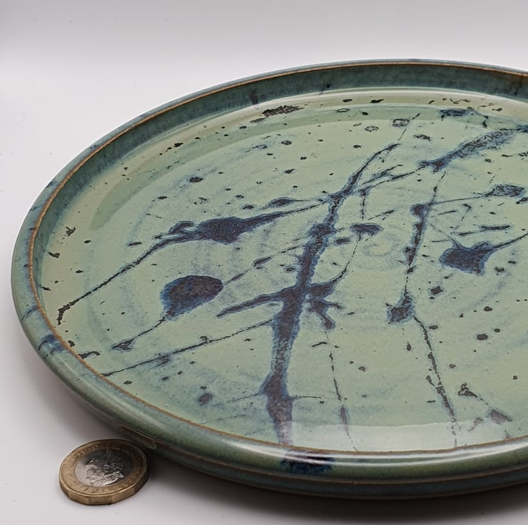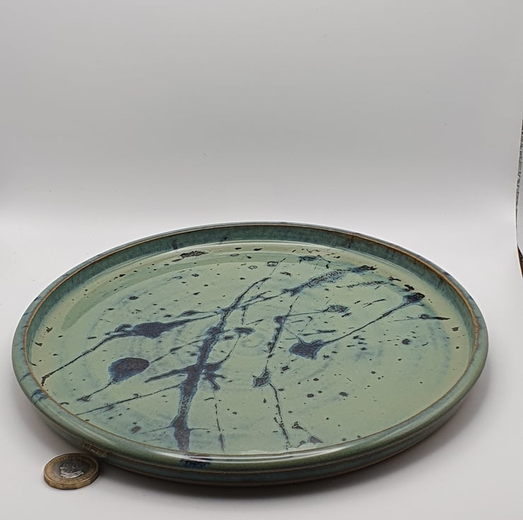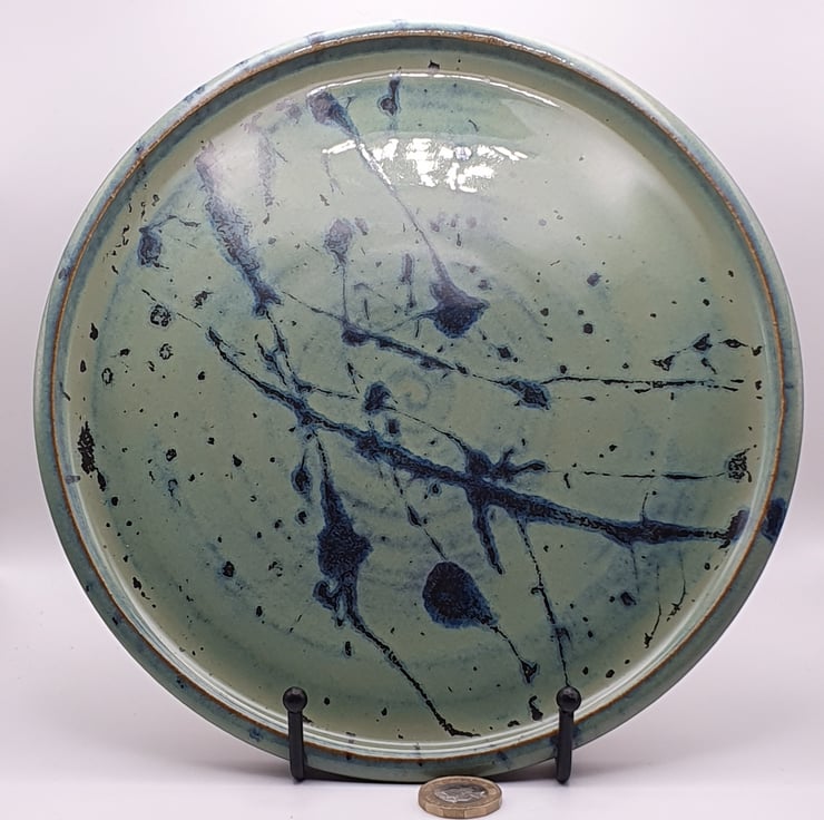 Wheel thrown large (dinner plate size) platter. Glazed in turquoise with flecks of brown giving a vibrant sense of movement to the surface!