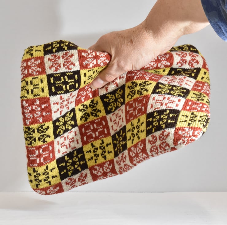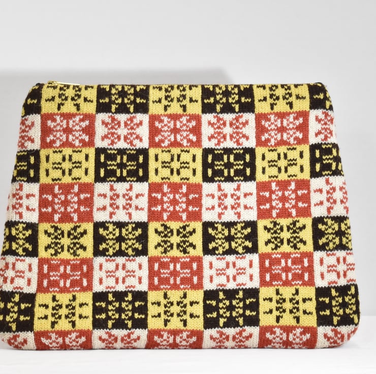 The motifs on this clutch bag are generated by the "Conway's Game of Life" algorithm. The rules of the game transform one motif to another and then to the third before returning to the first again. The sequence appears to pulse so it was nicknamed the Pulsar pattern. I created the checkerboard layout and colour scheme to reference to some patterns I've seen in 19th century Fair Isle knitwear.