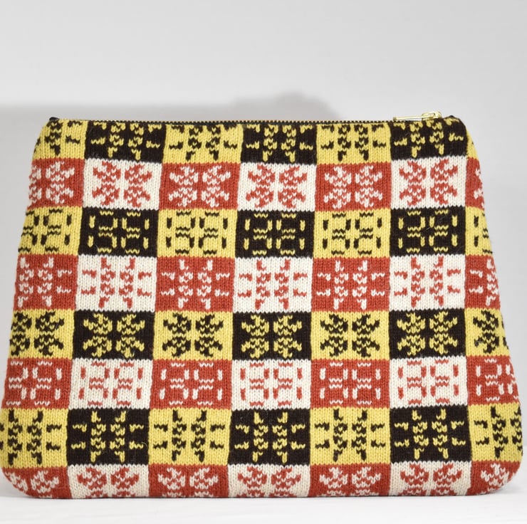 A neat clutch bag in a four- colour verstion of the Pulsar Check pattern from Knot Unknot's latest collection. It has a sturdy zip and lining and is ideal for carrying cash, bank cards, phone, glasses, keys and everything else you need while out and about. The outer fabric is pure wool grown and spun in Shetland. The lining is black polyester cotton and the zip is black with gold coloured metal. The dimesions are approximately 33cm (w) by 25cm (h).