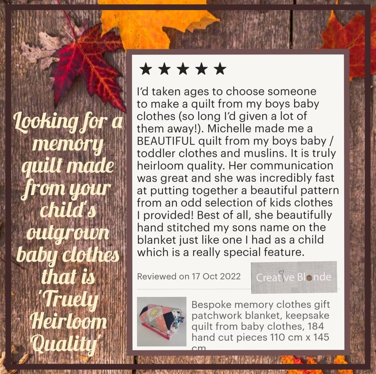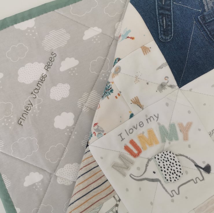 I create high end, top of the range memory quilts, each piece of your baby's clothes are cut and fused to a special interfacing to extend their life as a quilt, they are then sandwiched between high grade wadding, and each quilt is backed with soft grey cotton jersey with white stars, (please get in touch if another colour is required). Each blanket is quilted and finished with hours and hours or unique hand sewn binding.