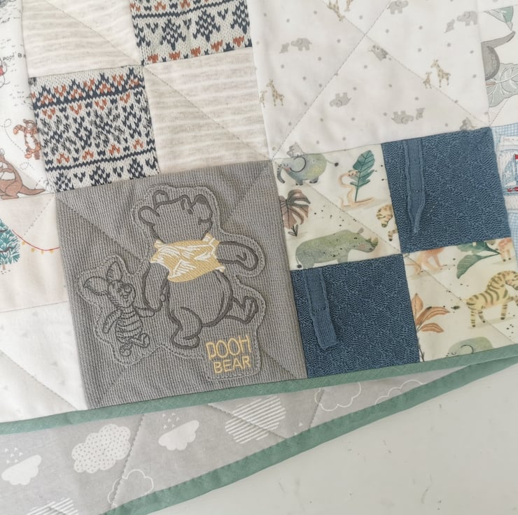 Beautiful medium square memory quilt. These very special blankets make precious keepsake memory gifts, all lovingly sewn together in a process where each square is fussy cut from your child's outgrown clothes, fused to a layer of luxury interfacing to stabilize and prolong the life of your quilt, each square is then pressed and joined to create this beautiful and unique patchwork quilt, super soft and cosy with all your treasured baby clothes. The top quilt is then quilted with a beautiful top quality wadding and jersey backing, and finished with hand sewn binding.