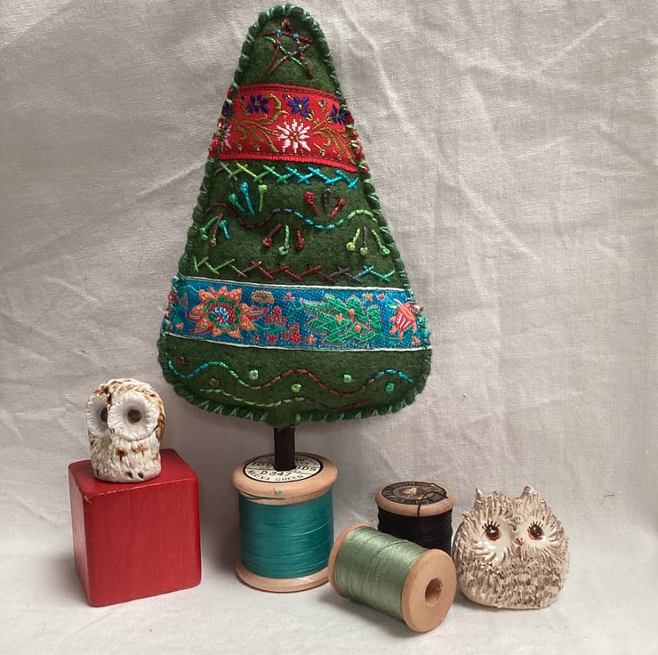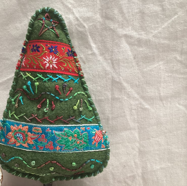 This lovely folk style Christmas tree is embellished with vintage braid and lots of colourful hand embroidery.