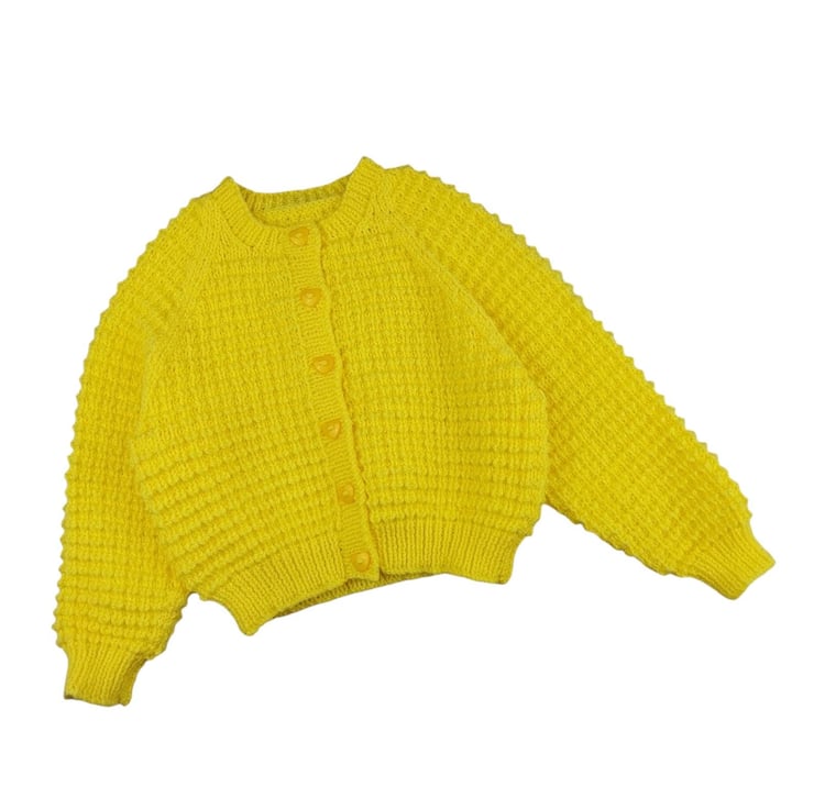 Carefully handcrafted, this cardigan showcases a textured pattern and easy-to-use yellow heart-shaped buttons, adding a touch of charm to your little one's outfit. Whether for a casual day out or a special event, this cardigan is sure to become a favourite in their wardrobe.