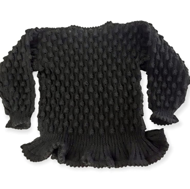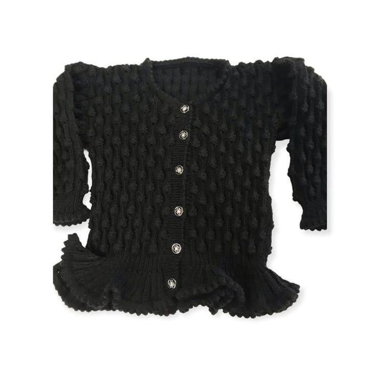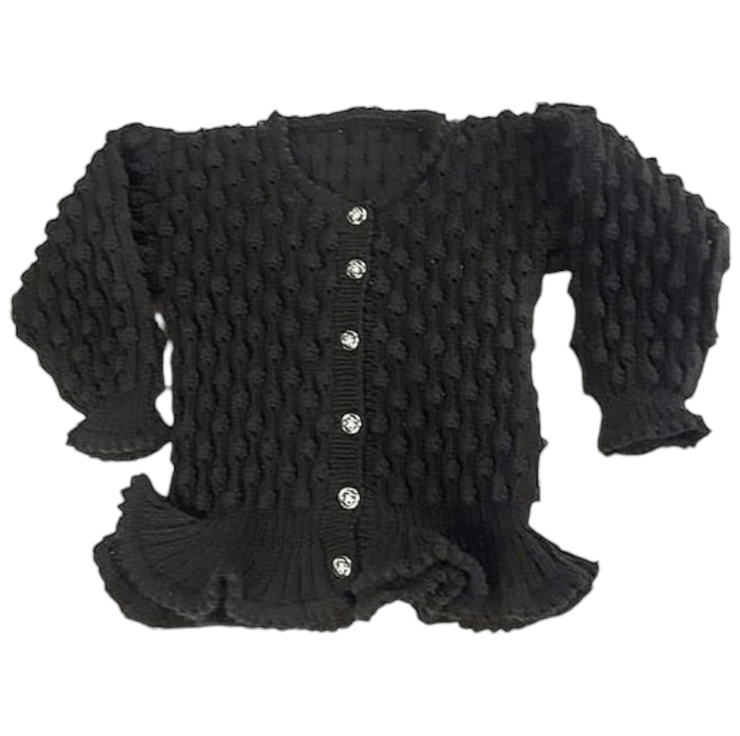 Elevate your little girl's wardrobe with this charming hand-knitted black cardigan, adorned with a delightful bobble pattern that adds a touch of playfulness and texture. Crafted with care, this cardigan boasts a round neck, long sleeves, and a stylish peplum design that sets it apart from the ordinary.