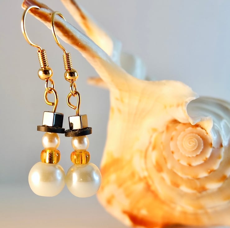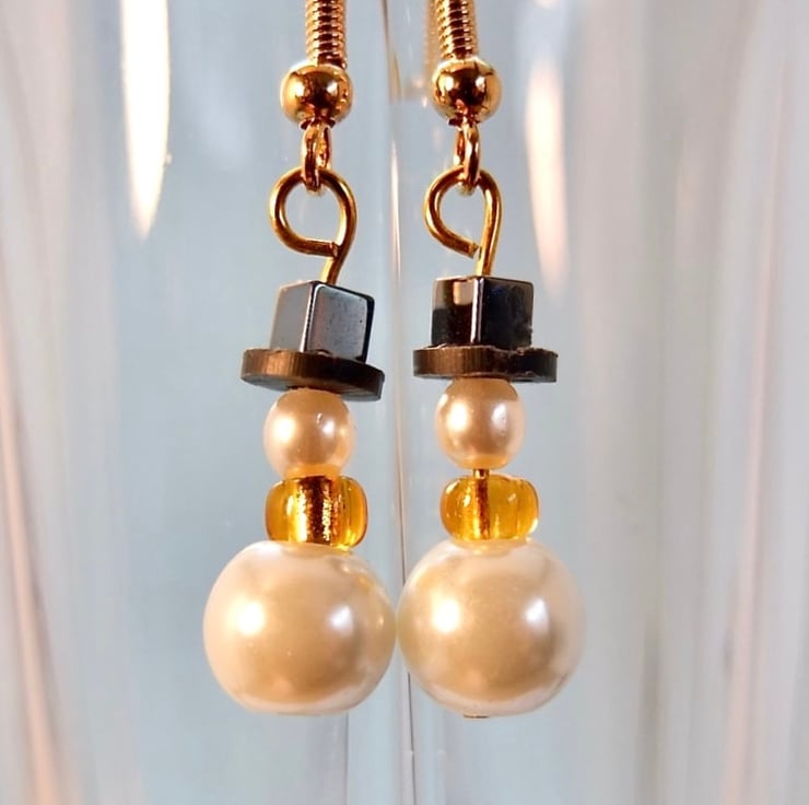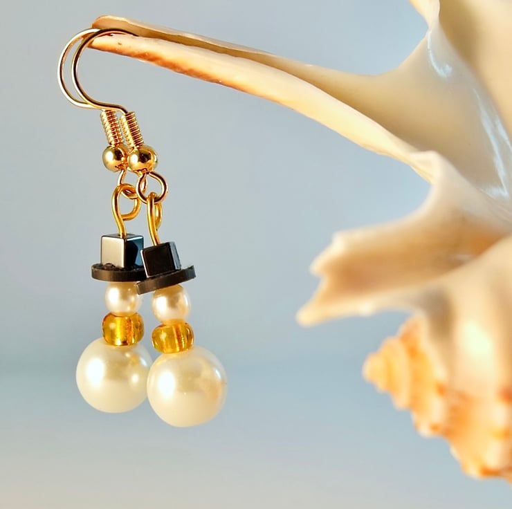 Cute little snowman earrings, made from glass pearl beads for his body and head.