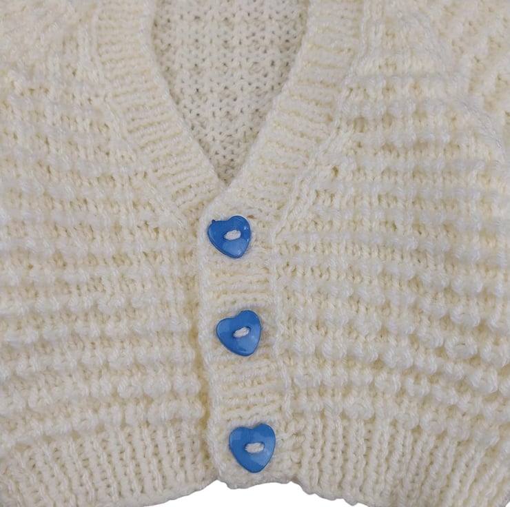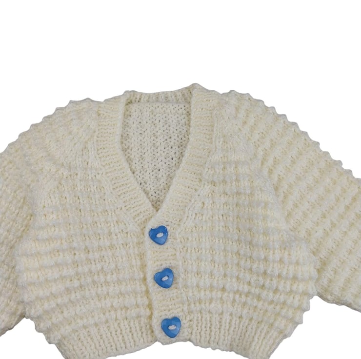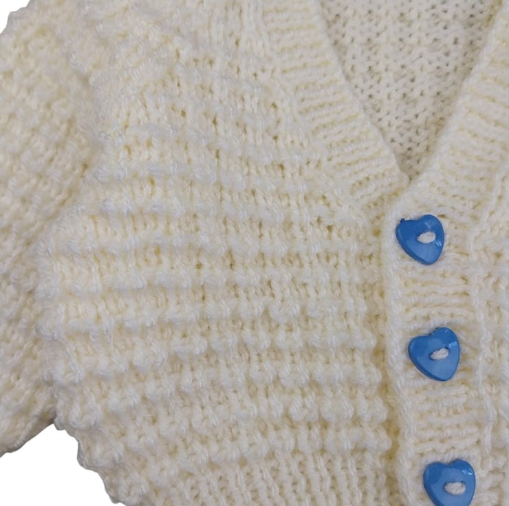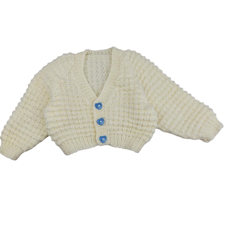 This soft cream baby cardigan has been lovingly hand knitted using gentle, baby-safe acrylic yarn. It features a textured stitch pattern that feels cosy yet breathable, perfect for keeping little ones snug and comfortable. Three sweet blue heart buttons add a simple, playful finishing touch.