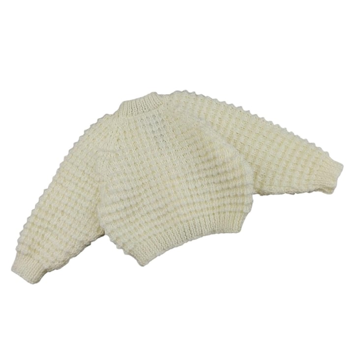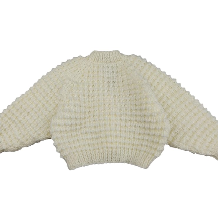 Keep your little one warm and cosy with this hand knitted baby cardigan, made with care and attention to every stitch. The soft cream yarn gives it a timeless look, while the three purple heart buttons add a gentle touch of colour and charm.