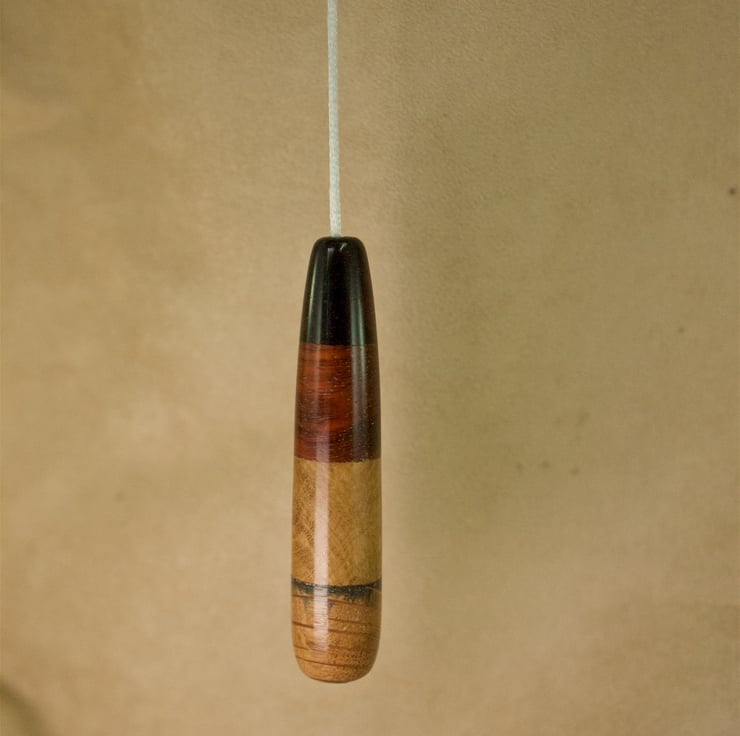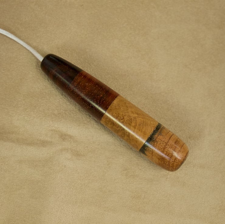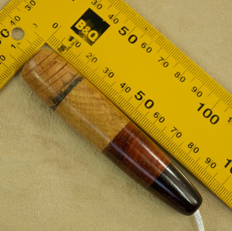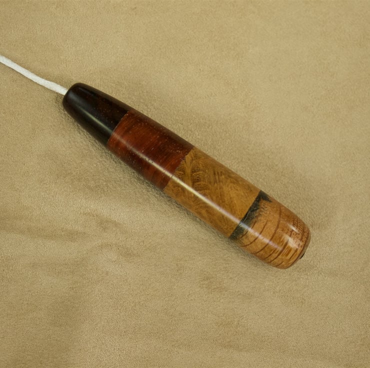 This unique handsome light pull pendant, hand made in my workshop on Sanday, Orkney, is supplied with 600mm of white cord so it's very easy to attach to your switch. Made using 4 different species of wood (from top to bottom, cocobolo, padauk, acacia and oak), glued seamlessly together and turned to shape on my lathe. The colours of the wood are all natural - I haven't used any dyes or stains. The oak section at the lower end was part of an old whiskey barrel stave, and still has the black stain caused when the cooper charred the inside of the barrel. The pendant is 95mm long and 20mm wide.