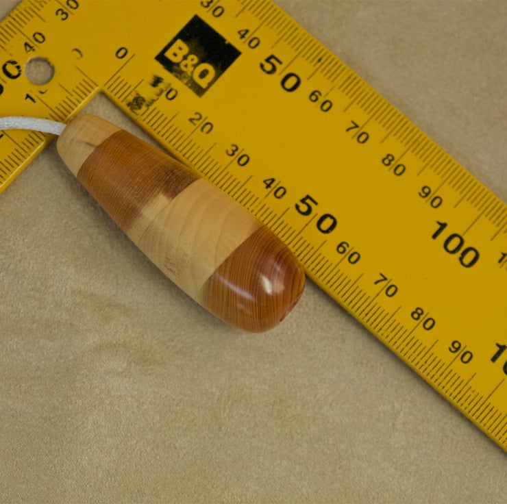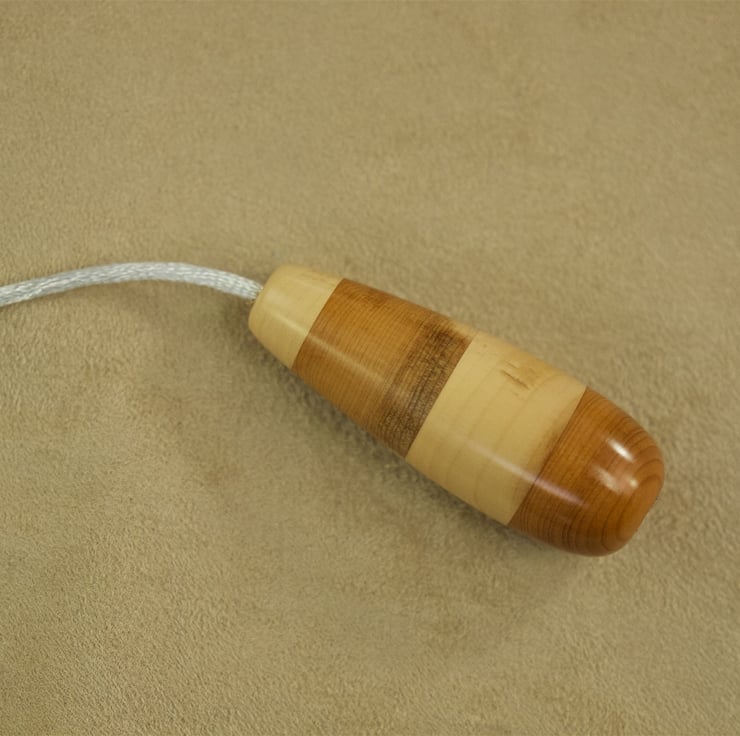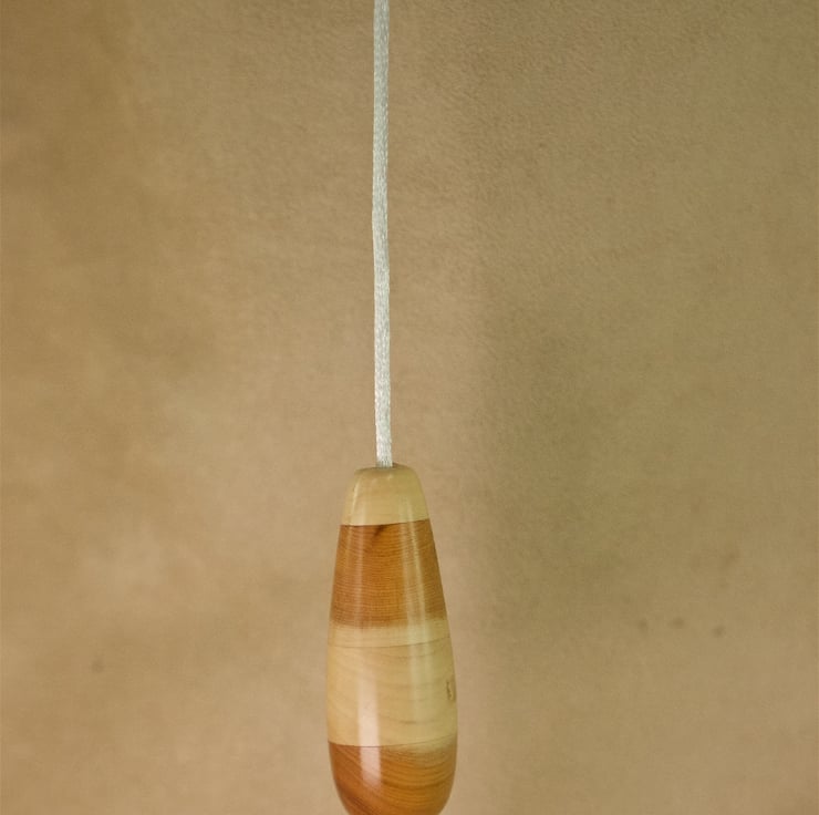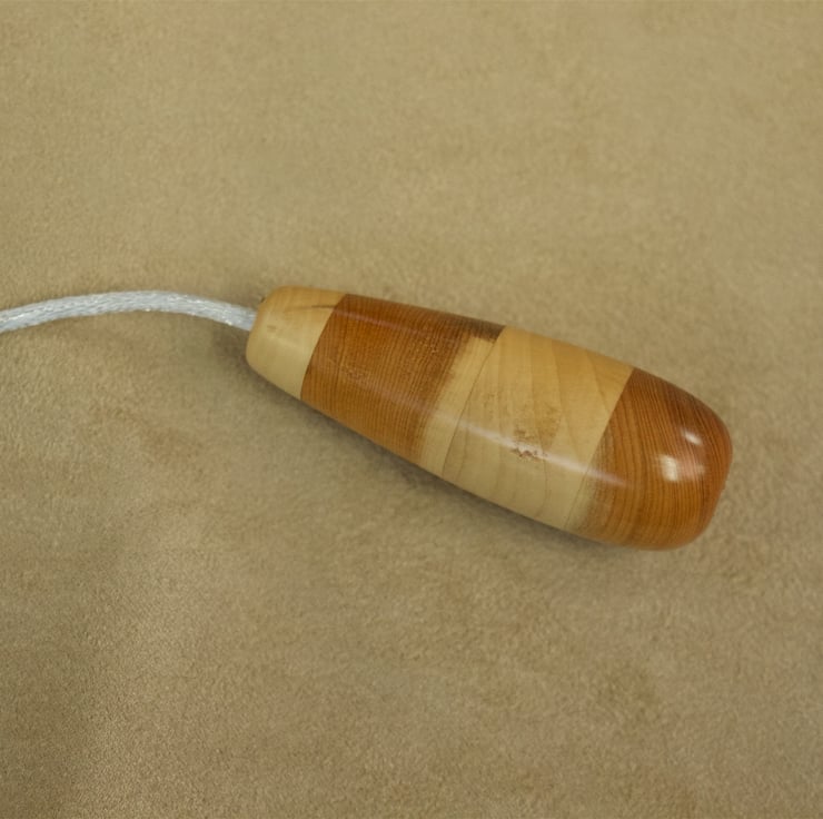 This unique light pull pendant, hand made in my workshop on Sanday, Orkney, is supplied with 600mm of white cord so it's very easy to attach to your switch. Made using 2 different species of wood (chestnut and yew), glued seamlessly together and turned to shape on my lathe, the colours of the wood are all natural - I haven't used any dyes or stains. The pendant is 55mm long and 21mm wide, and and I have turned it to form a pear drop shape.