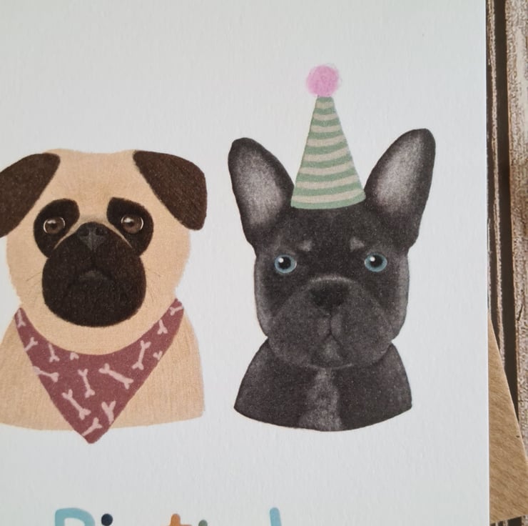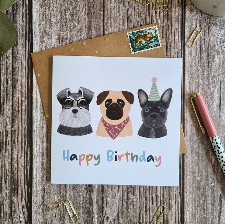 A beautiful illustrated 15cm x 15cm birthday card which will make anyone smile, who cant resist Party Dogs. The card and the kraft envelope are both recyclable and comes protected in a plastic sleeve.