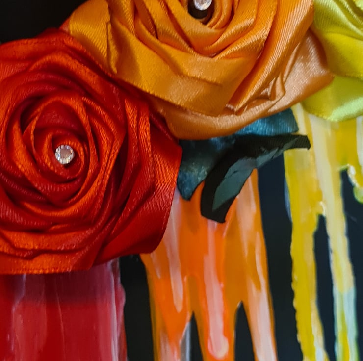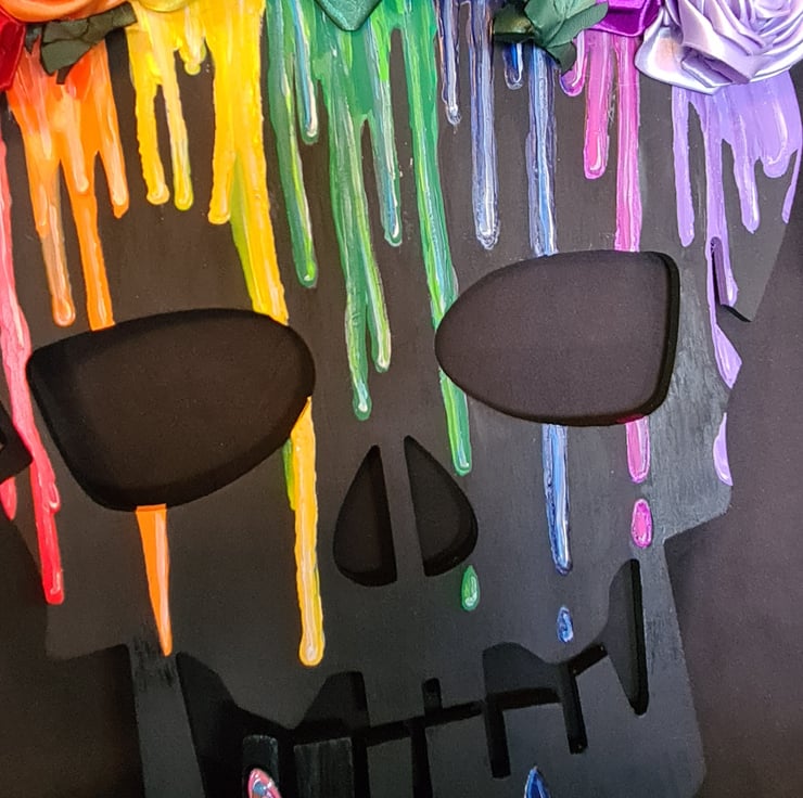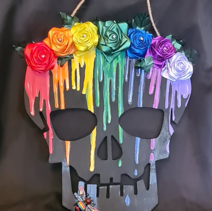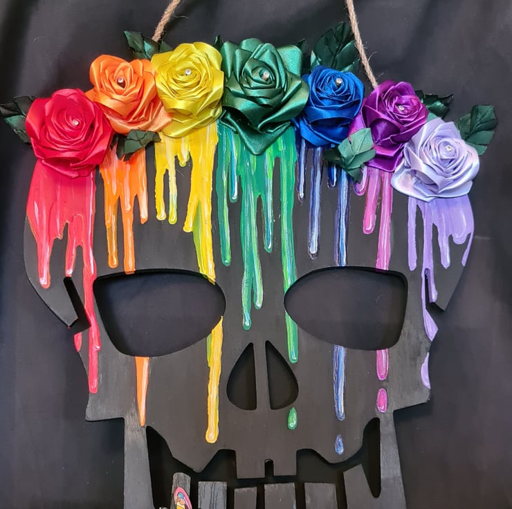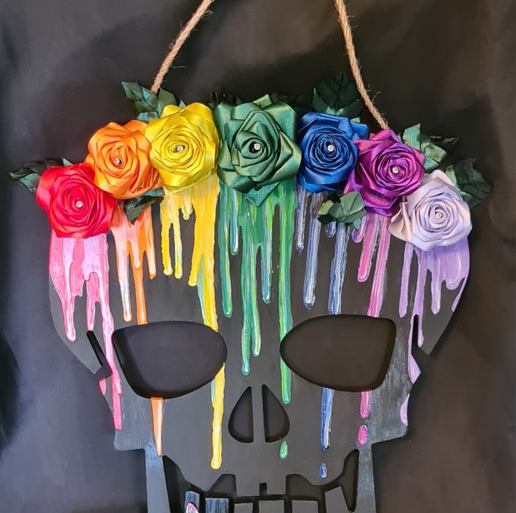 A gorgeous wooden Skull shaped wall hanger painted in black with Rainbow drip details and decorated with an array of Ribbon Roses and a Rainbow Butterfly embellishment. A large and colourful spooky decoration.