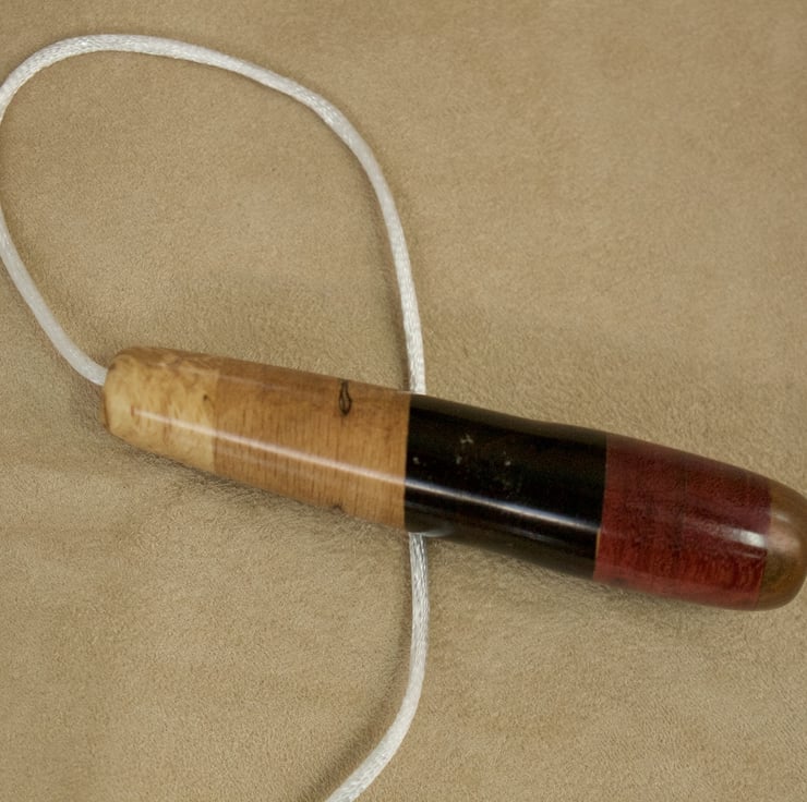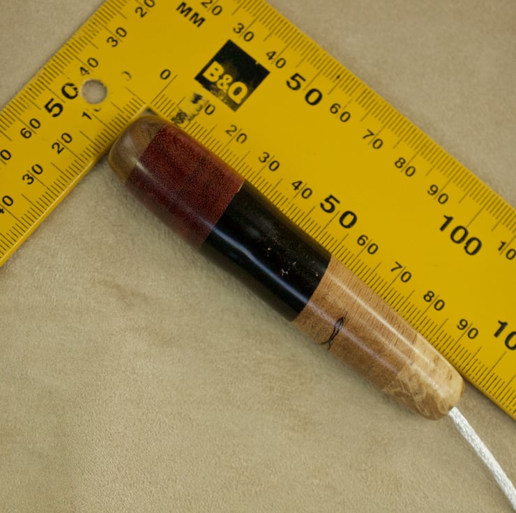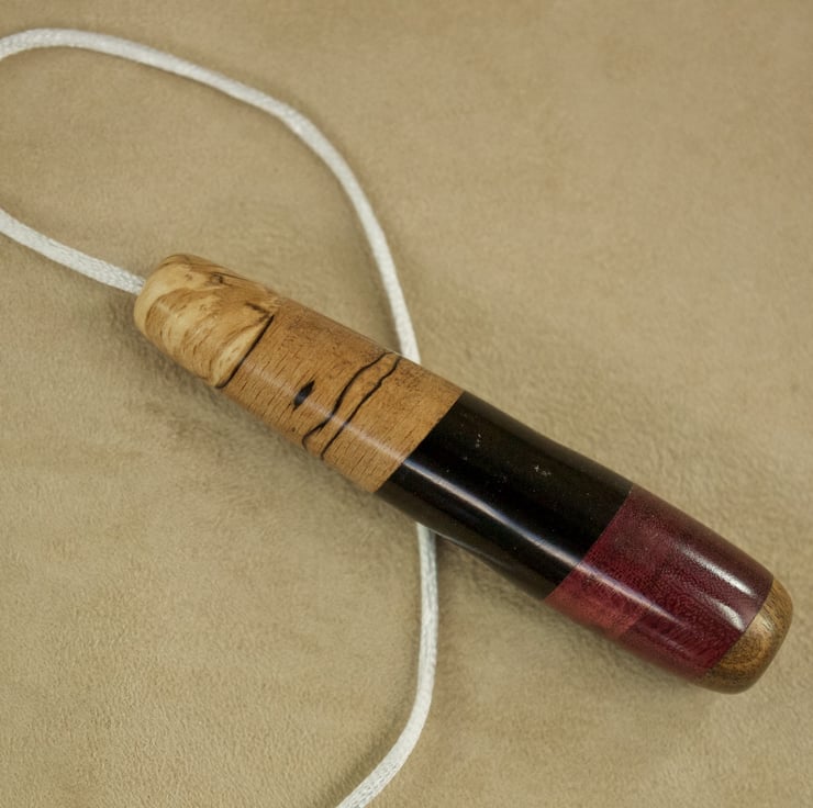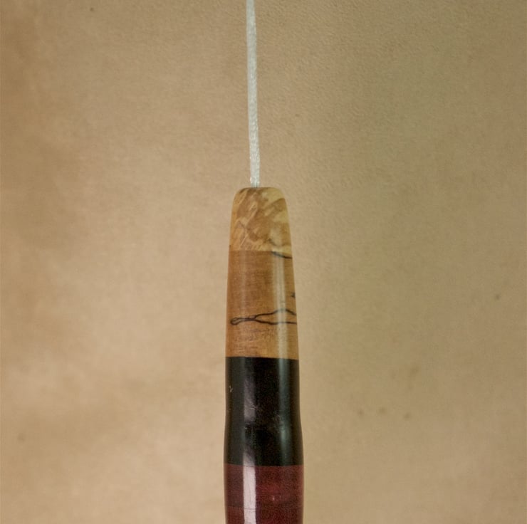 This unique handsome wood light pull pendant, hand crafted in my workshop by the coast on Sanday, Orkney, is supplied with 600mm of white cord so it's very easy to attach to your switch. Made using 5 different species of wood (from top to bottom, chestnut, spalted beech, cocobolo, padauk, oak), glued seamlessly together and turned to shape on my lathe, the colours of the wood are all natural - I haven't used any dyes or stains. The pendant is 95mm long and 20mm wide,