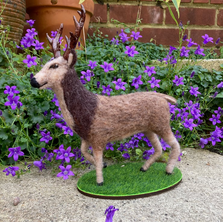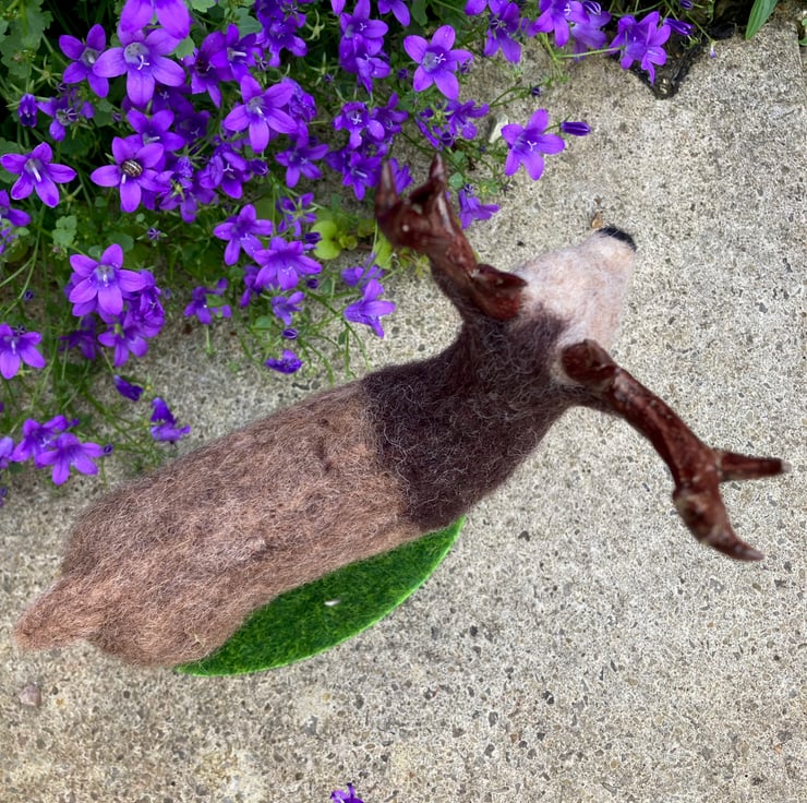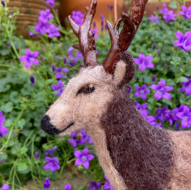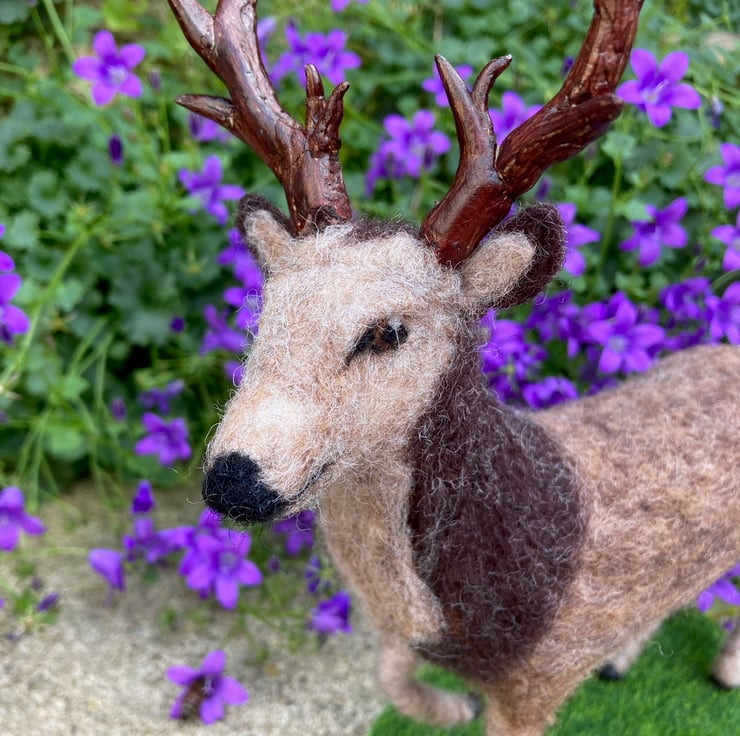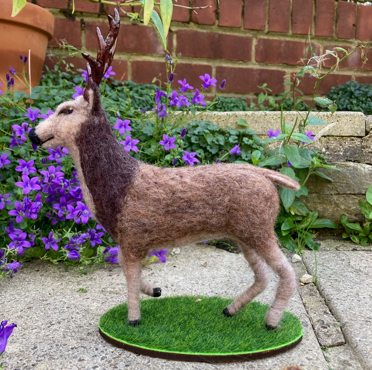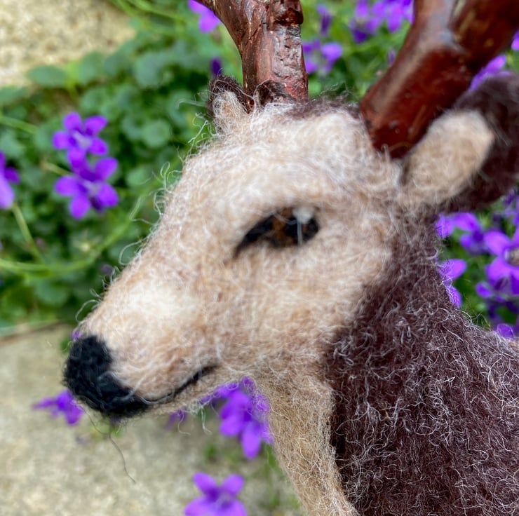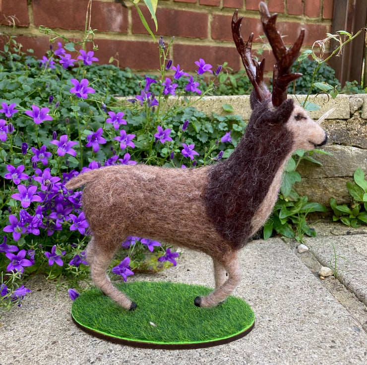 This magnificent deer stag has been needle felted using woollen fibres and a barbed felting needle. This stag has been sculpted from core wool and then a top coat of woollen fibres in appropriate colours has been added. His legs are formed over a wire armature to aid strength and stability. The antlers are formed from hand painted silk clay and the hooves from epoxy resin. The stag has been mounted on an oval wooden slice covered with artificial grass material.