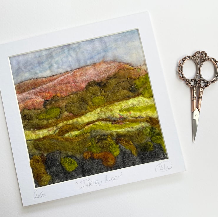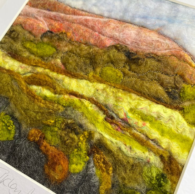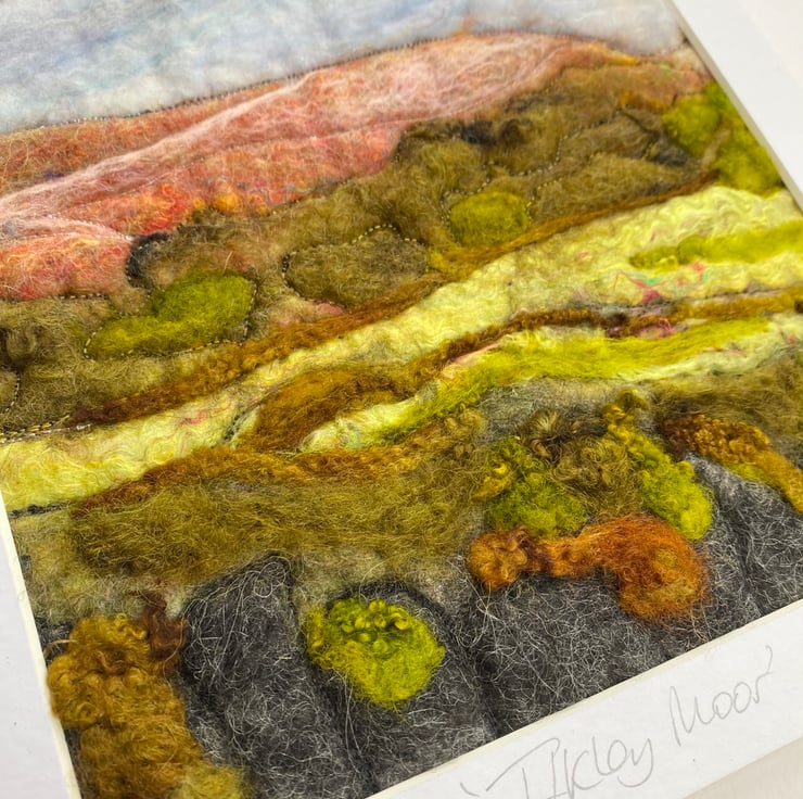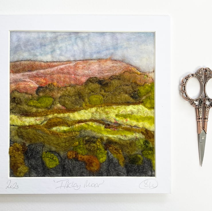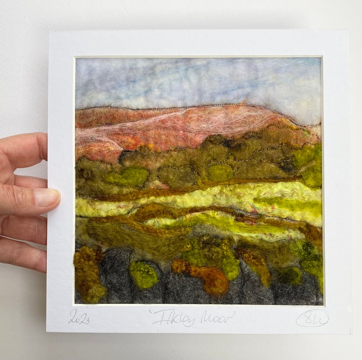 This textured piece is part of my Moorland series. It shows Ilkley Moor as seen from my village, over a dry stone wall covered in moss, across the fields. It’s a wet felting, embellished with needle felting and free motion embroidery.