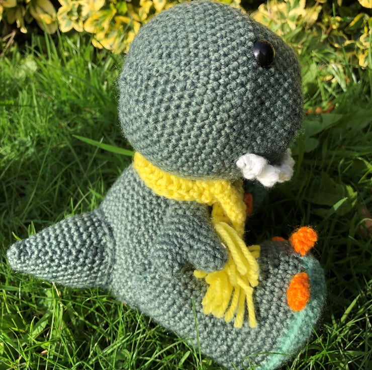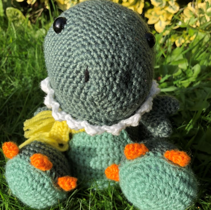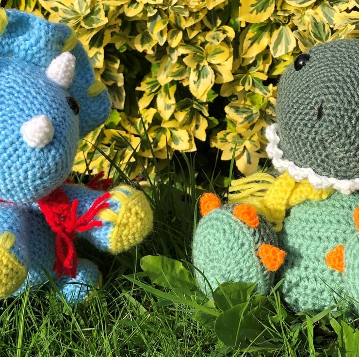 Handmade crocheted stuffed dinosaurs.