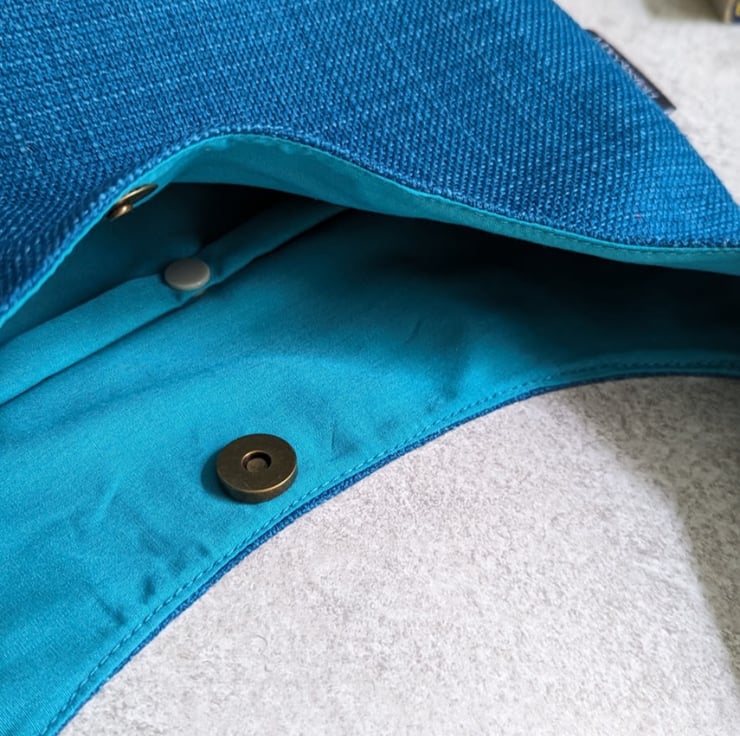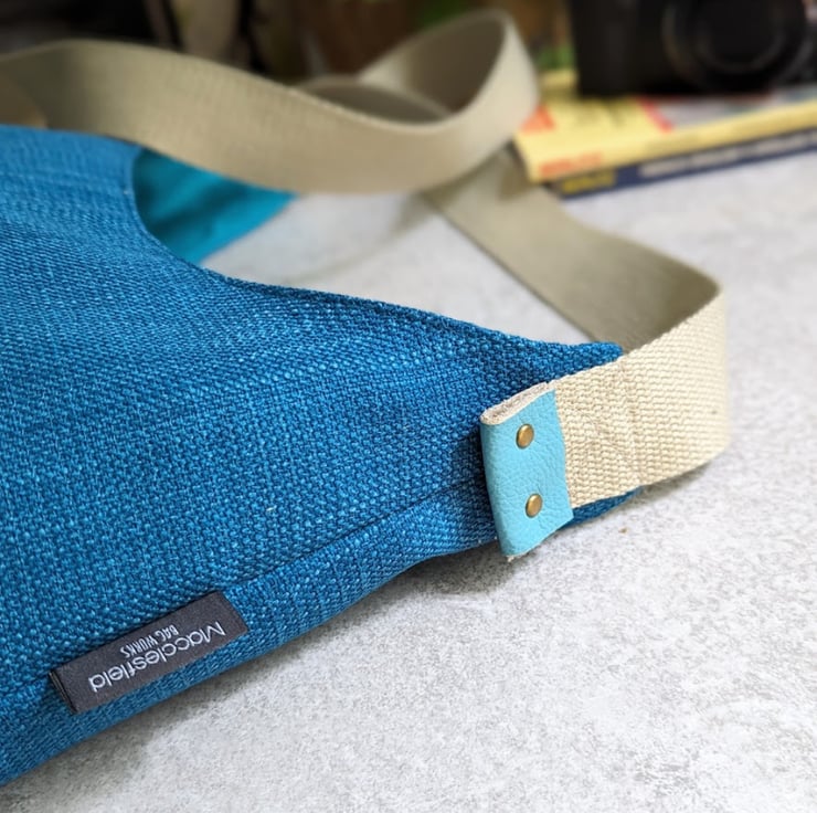 The strap is 38mm wide cotton webbing and has been finished with a co-ordinating, turquoise riveted leather tab which compliments the fabrics of the bag. The strap is securely stitched onto the bag above the leather tabs.