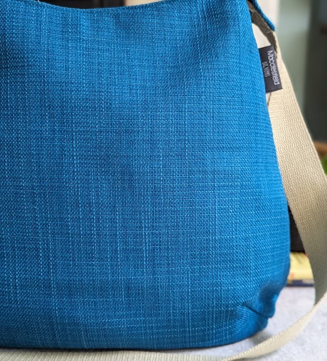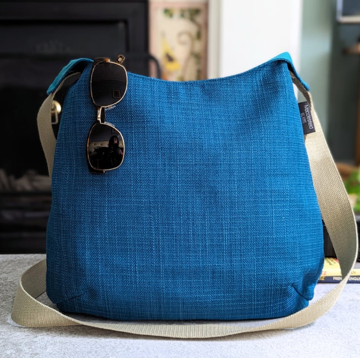 Handmade using a sturdy peacock blue/teal coloured woven soft furnishing fabric remnant and lined with hard-wearing turquoise polyester cotton, this casual bag has a fab boho feel with stylish simple lines.