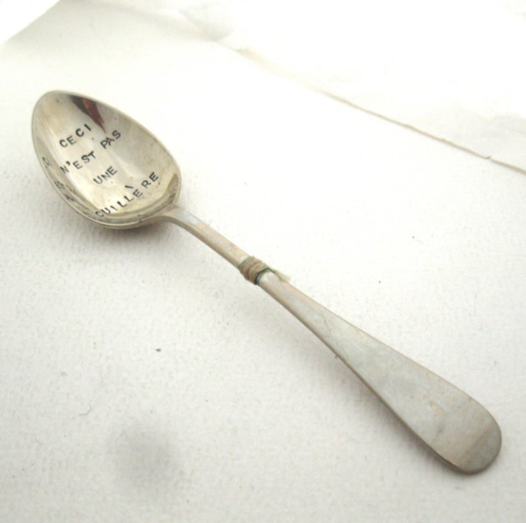 A hand stamped vintage nickel silver alloy tea spoon with wording (in shouty little block capitals) inspired by Rene Magritte's masterpiece 'The Treachery of Images'. Is it or isn't it a spoon? Is it still a spoon if it says it isn't one? Is the inscription true, or not? Is it Art? Either way you can stir your tea with it so ultimately these questions are of purely intellectual interest. It's a plain teaspoon measuring approximately 12.5cm long and I would guess it's 1940s.