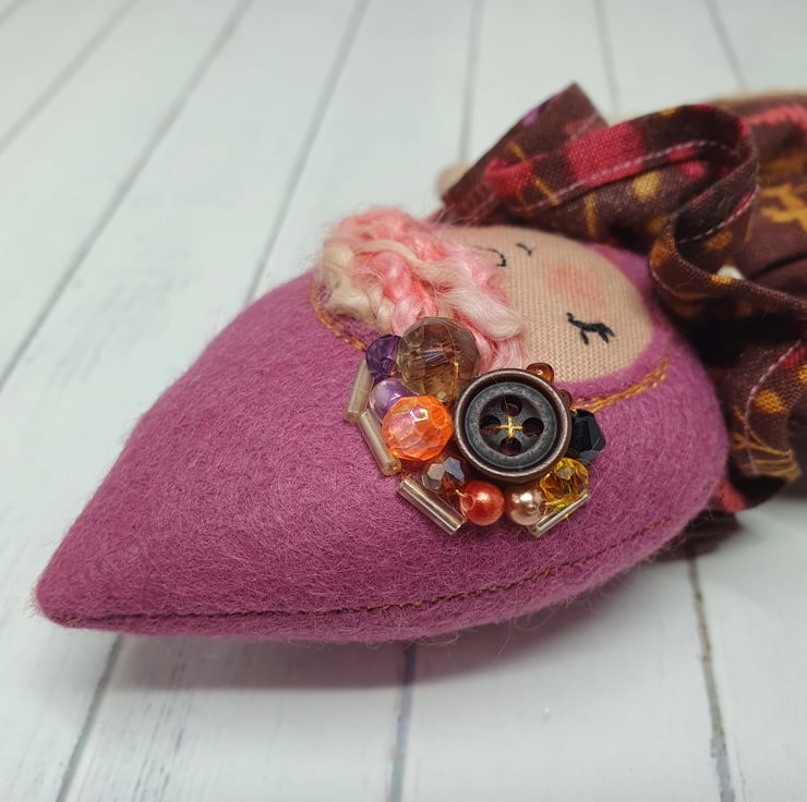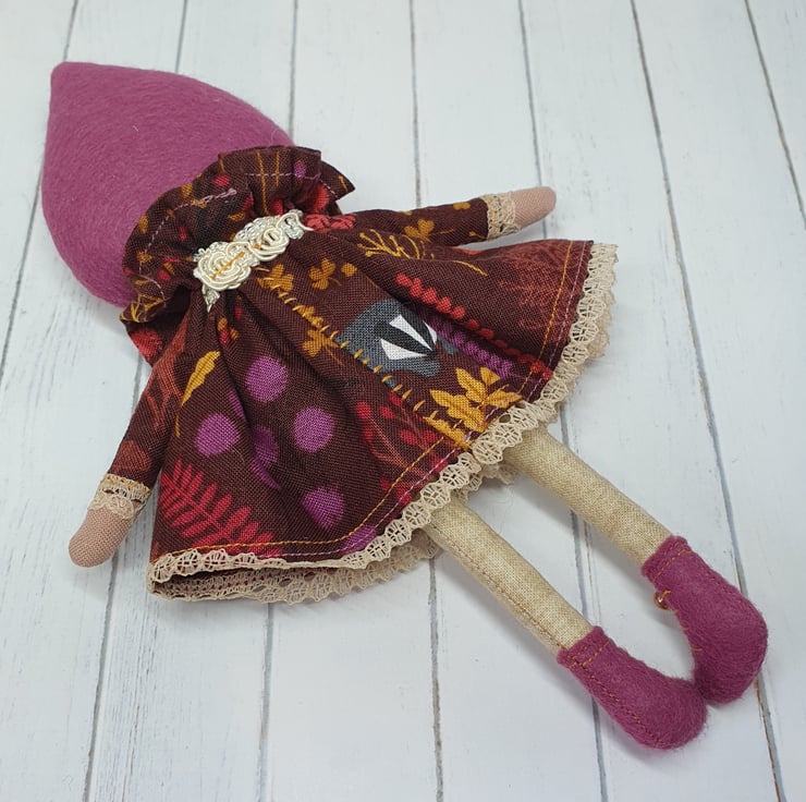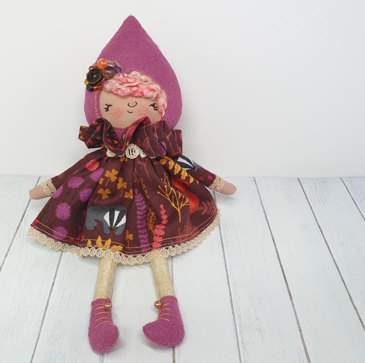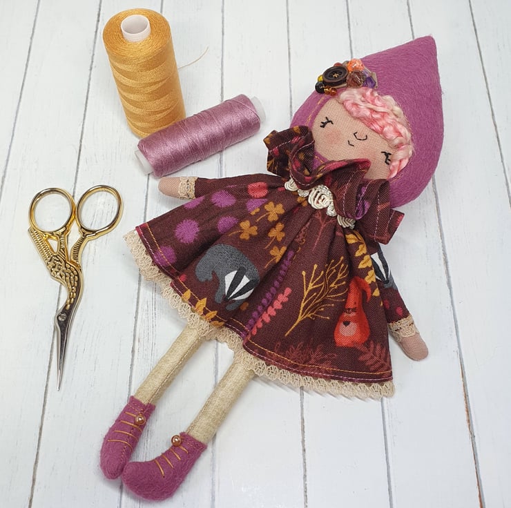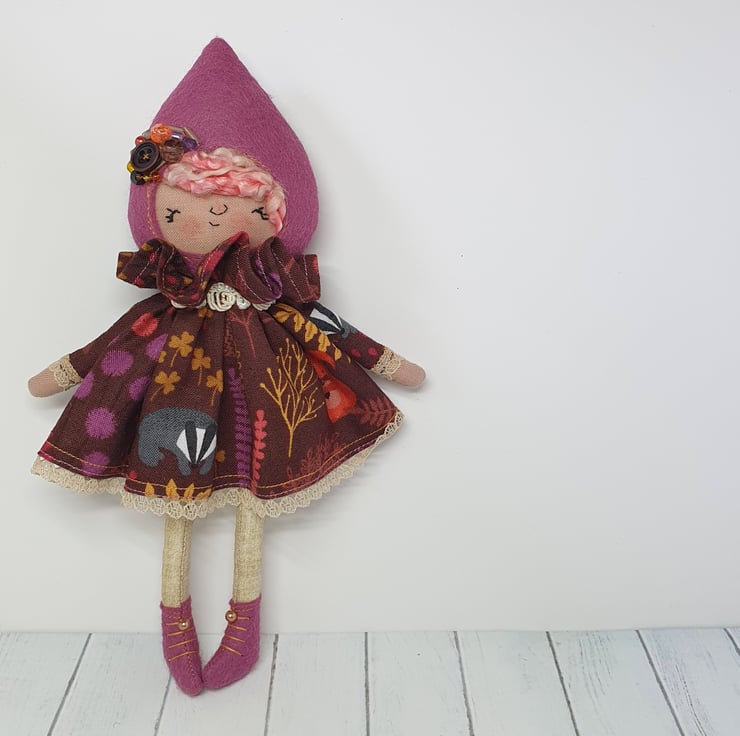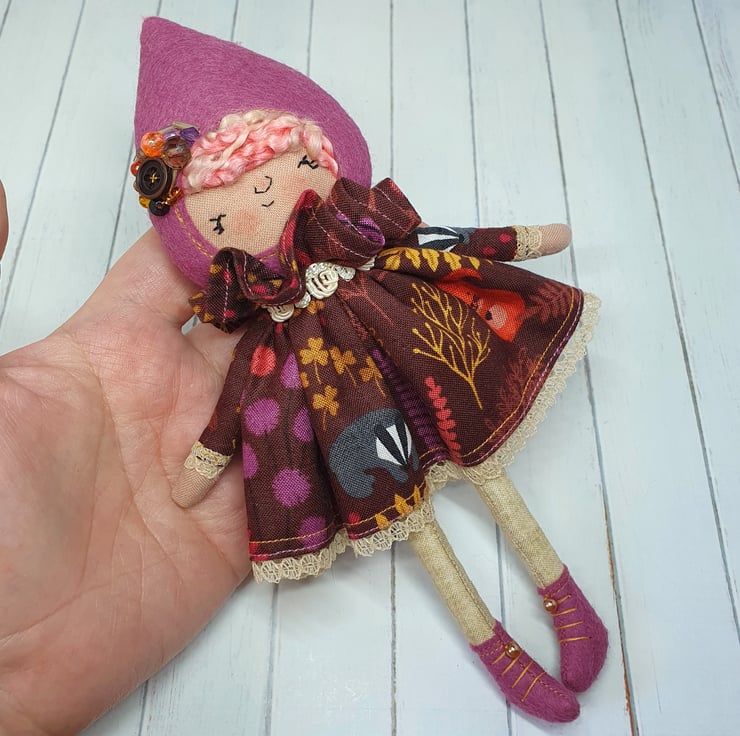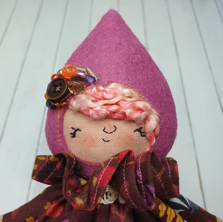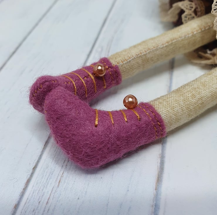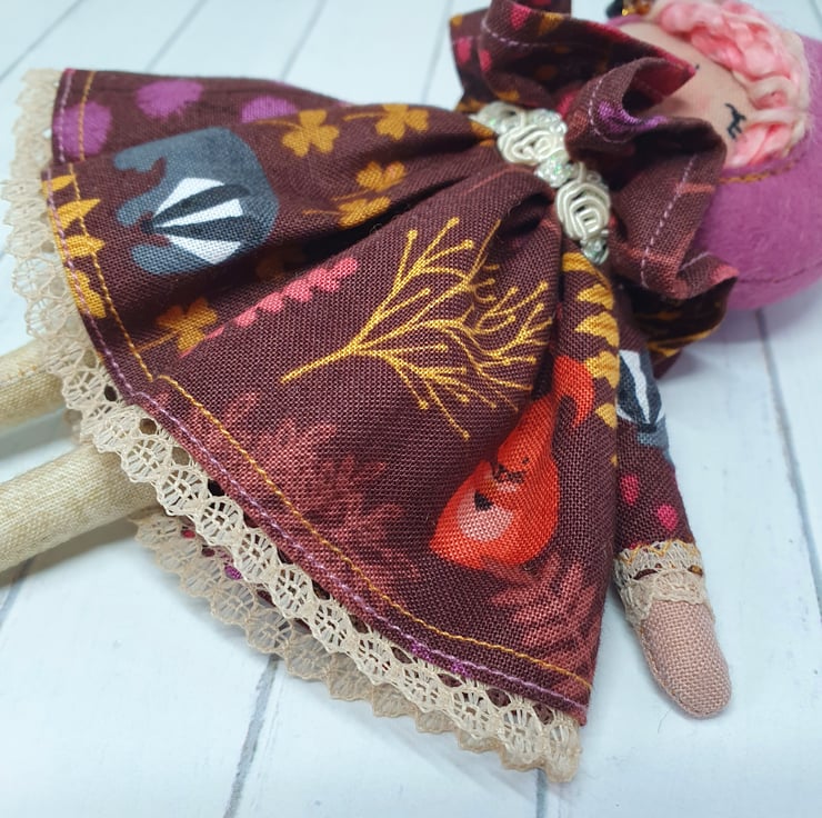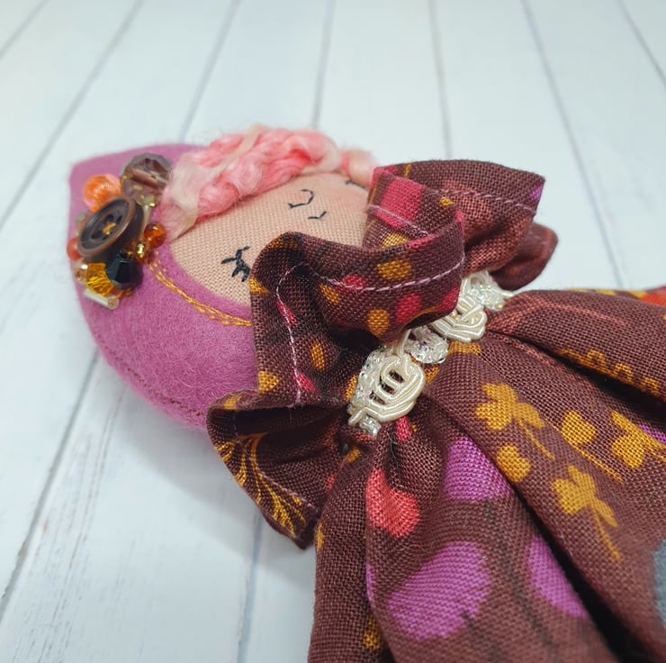 Handmade doll with hand embroidered face and autumn animal print dress with lace trim. She wears a sparkly cream trim around her neck. This little doll has bead embellished felt boots with hand sewn laces and stuffed cotton legs. She has natural wool hair and a new and upcycled bead headpiece sewn into place. She measures roughly 21cm tall. This is for decorative purposes only and not a toy.