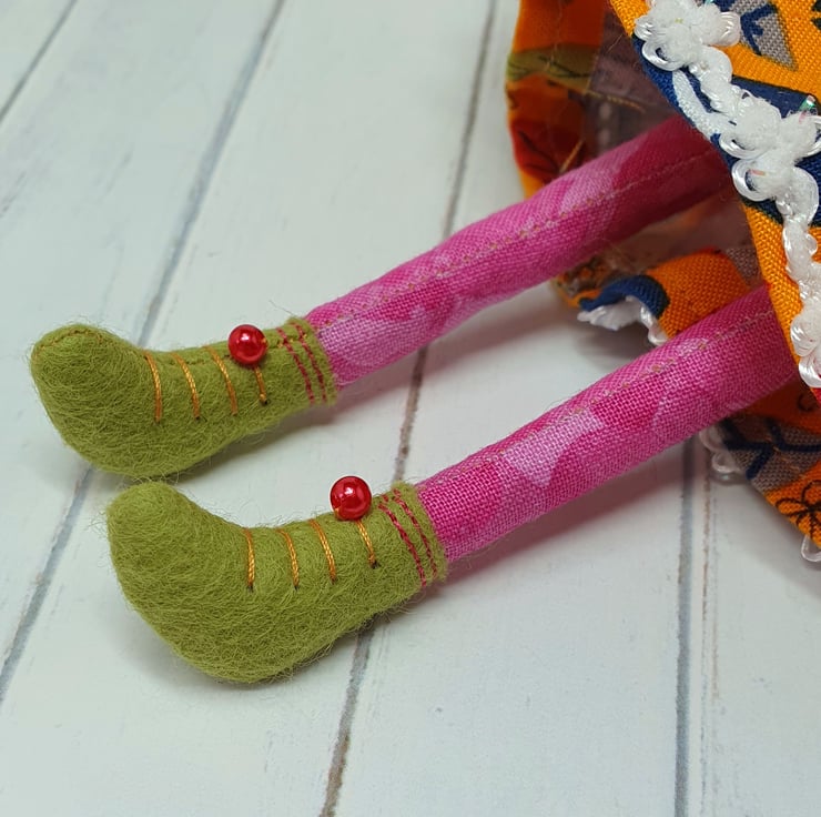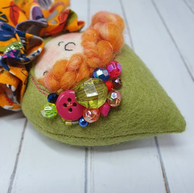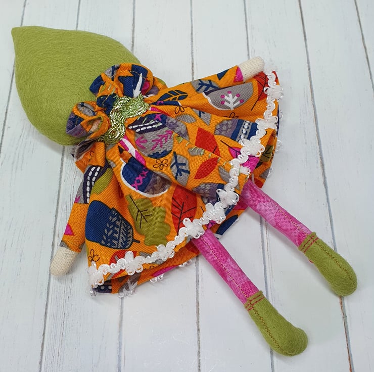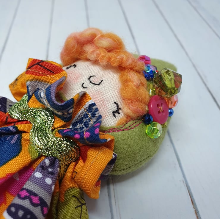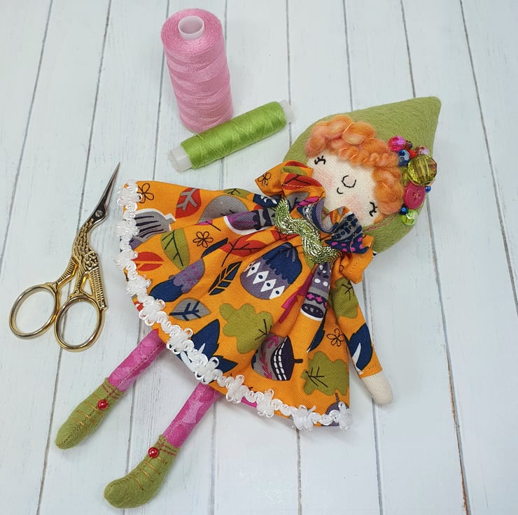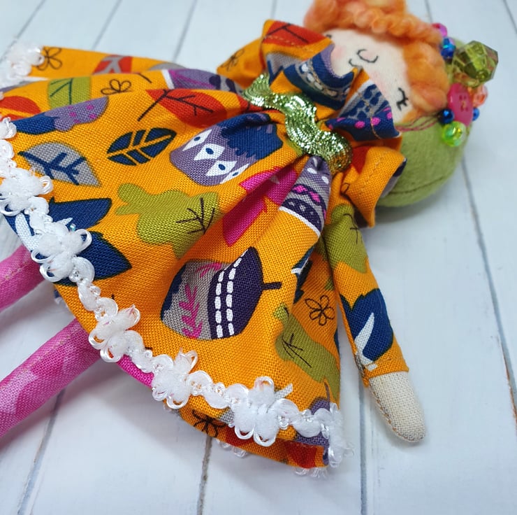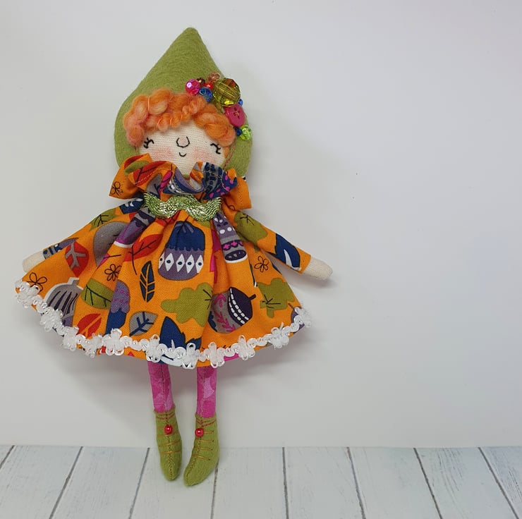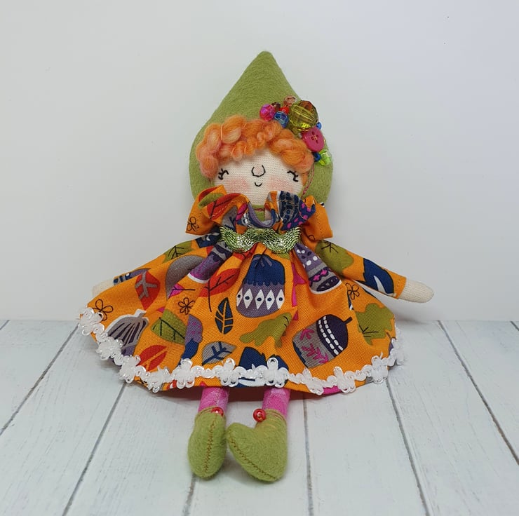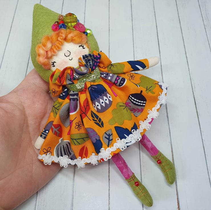 Handmade doll with hand embroidered face and acorn and leaf print dress with sparkly trim. She wears a sparkly ric rac around her neck. This little doll has bead embellished felt boots with hand sewn laces and stuffed cotton legs. She has art yarn wool hair and a new and upcycled bead headpiece sewn into place. She measures roughly 20cm tall. This is for decorative purposes only and not a toy.