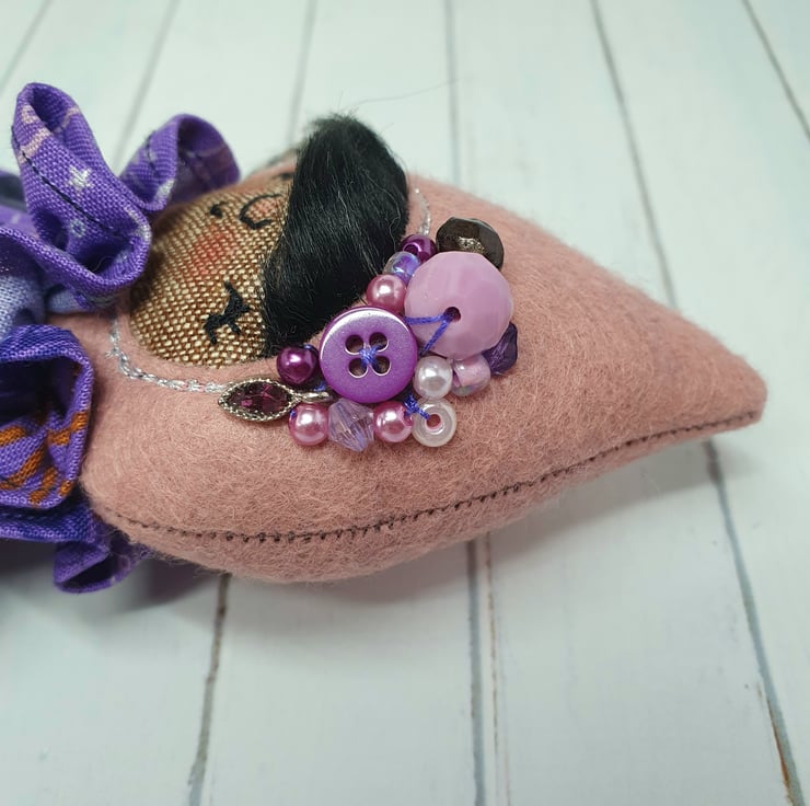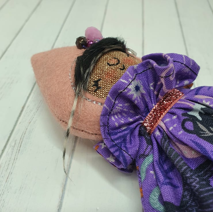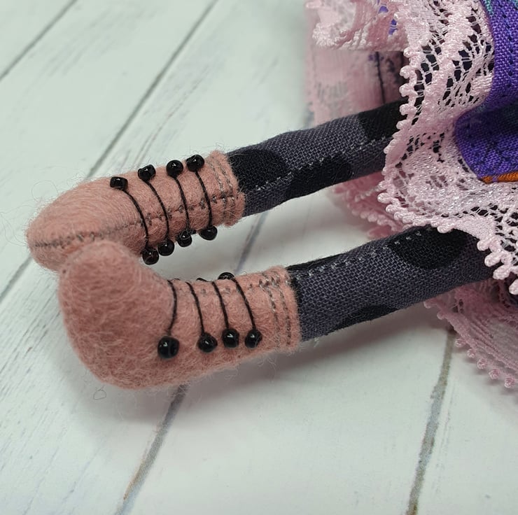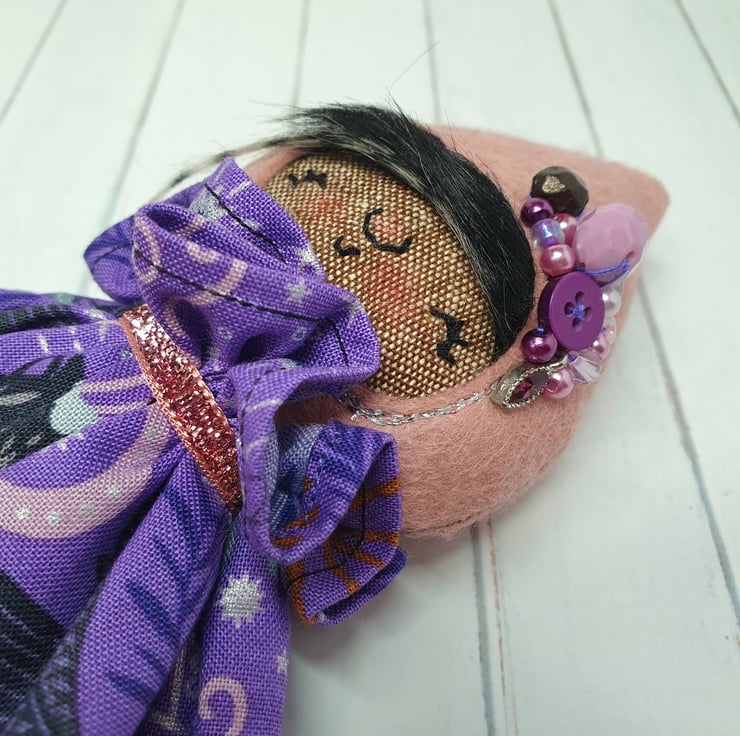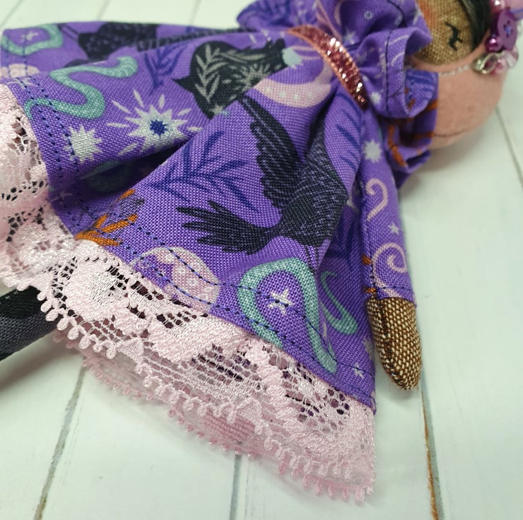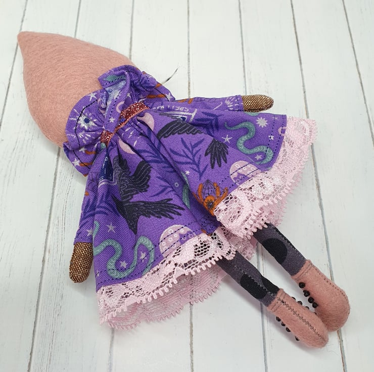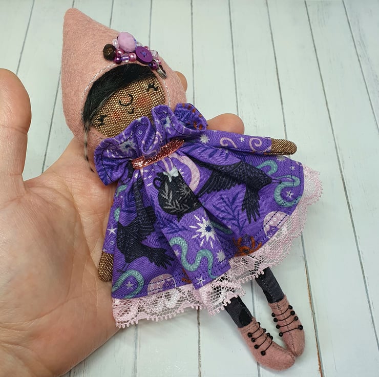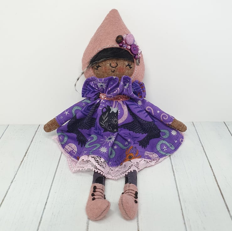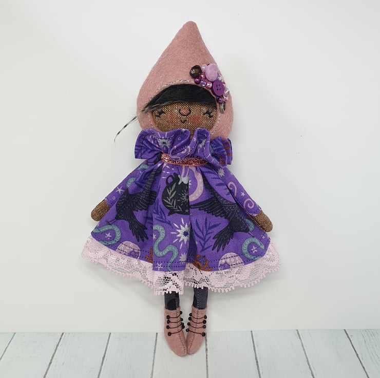 Handmade doll with hand embroidered face and raven and cauldron print dress with lace trim. She wears a sparkly ribbon around her neck. This little doll has bead embellished felt boots with hand sewn laces and stuffed cotton legs. She has faux fur hair and a new and upcycled bead headpiece sewn into place. She measures roughly 21cm tall. This is for decorative purposes only and not a toy.