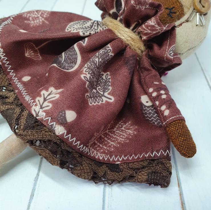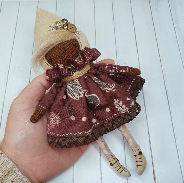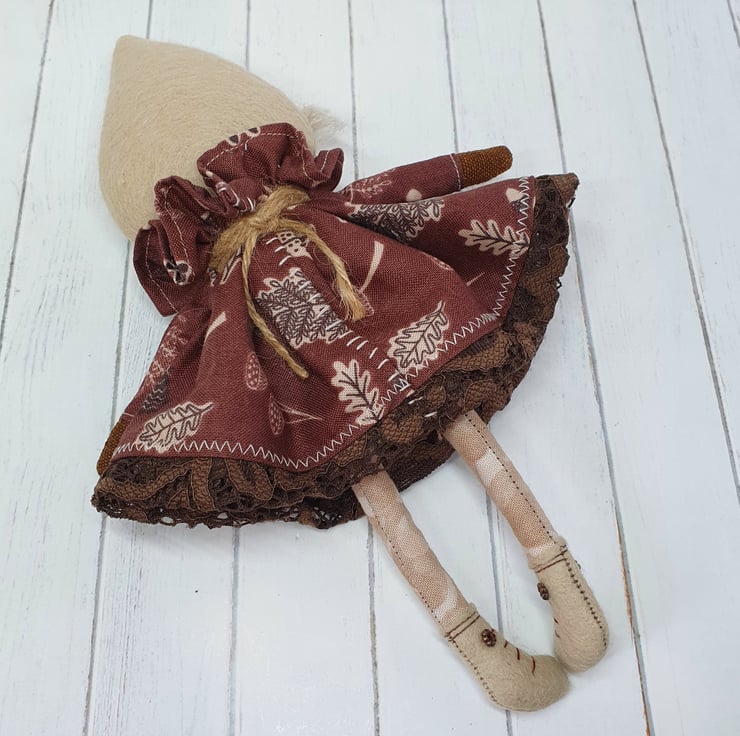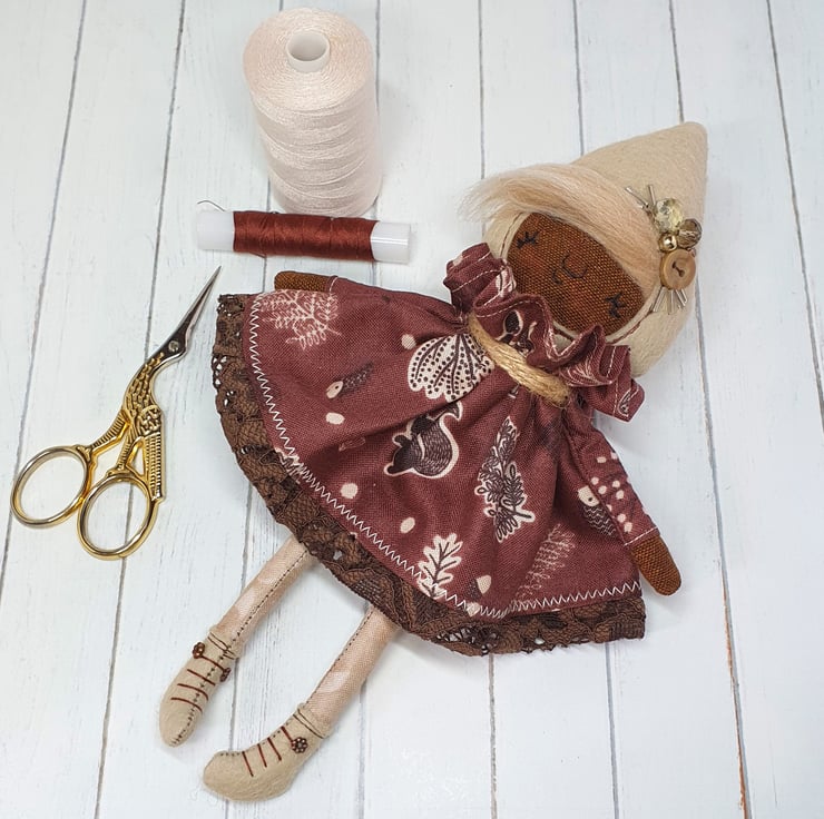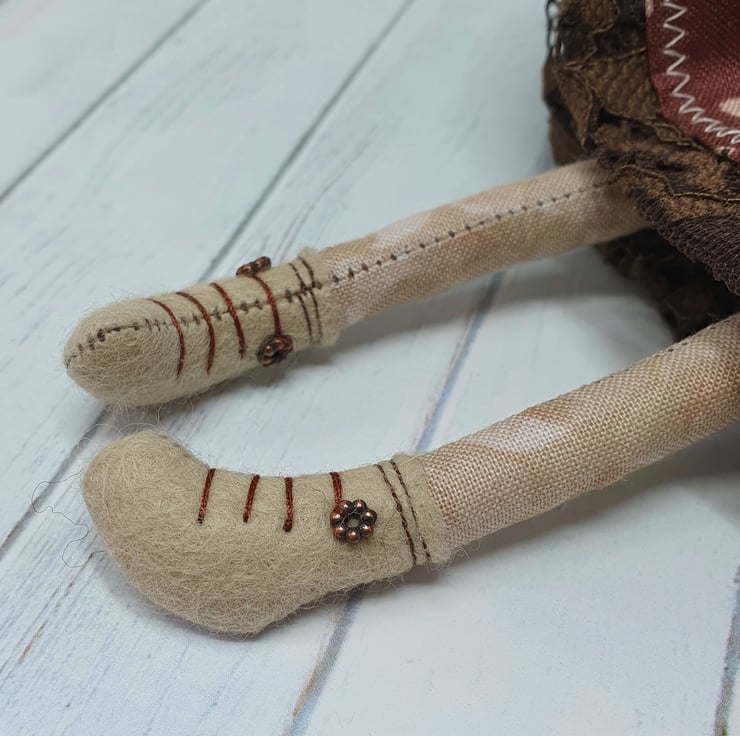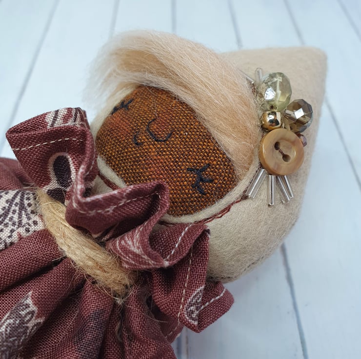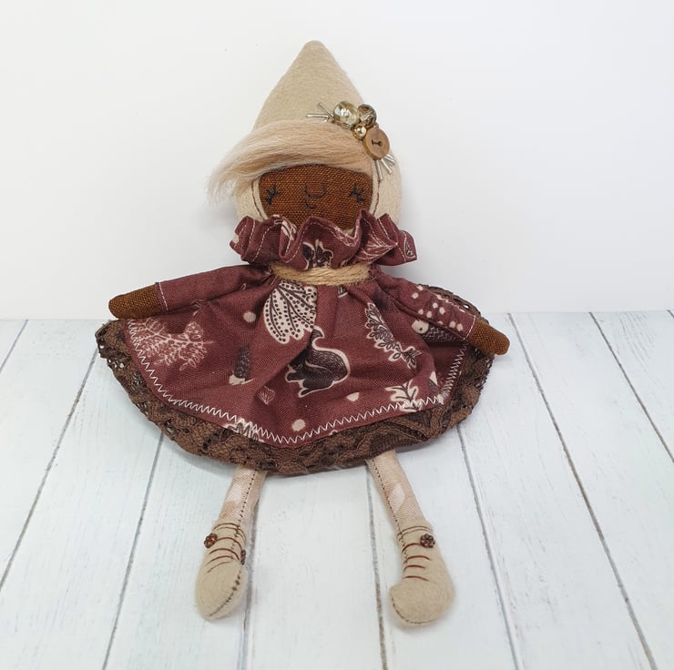 Handmade doll with hand embroidered face and nature print dress with lace trim. She wears twine around her neck. This little doll has bead embellished felt boots with hand sewn laces and stuffed cotton legs. She has faux fur hair and a new and upcycled bead headpiece sewn into place. She measures roughly 21cm tall. This is for decorative purposes only and not a toy.