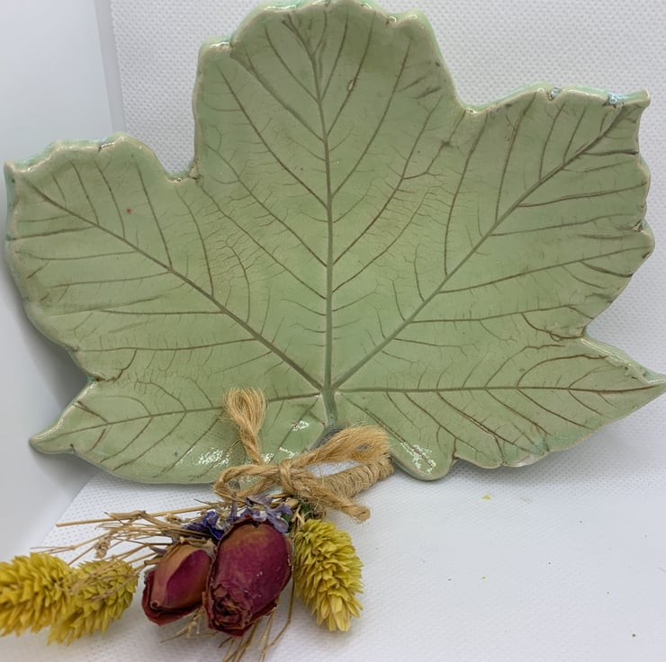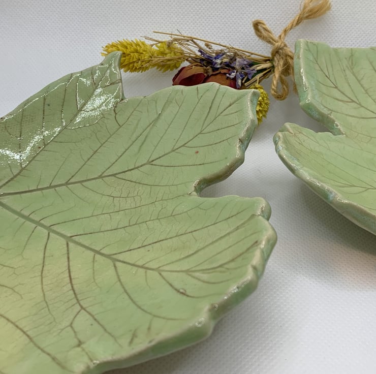 2 handbuilt dishes that can be used to serve food or store whatever you wish. Formed from a slab of clay imprinted with 2 leaves. After the bisque firing they were glazed in a light green celadon glaze that allows the detailed texture of the veins to show through! They are approx 5ins wide and the price is for the 2 dishes.