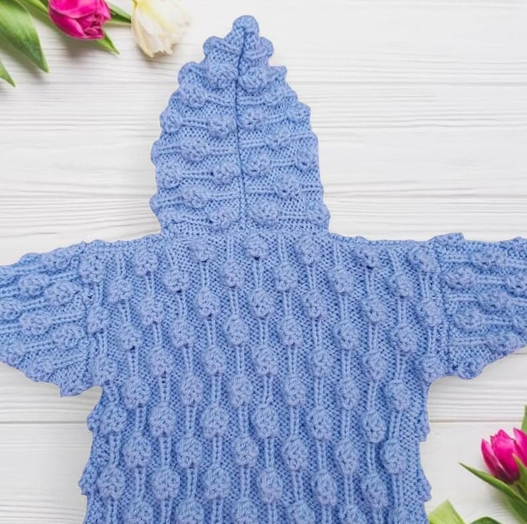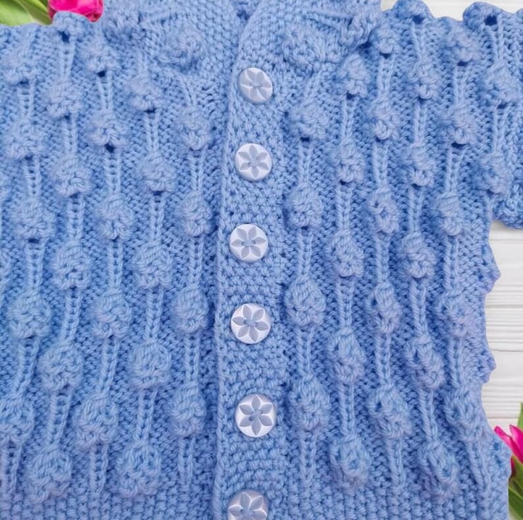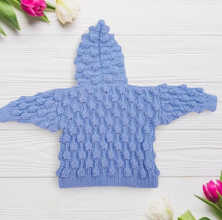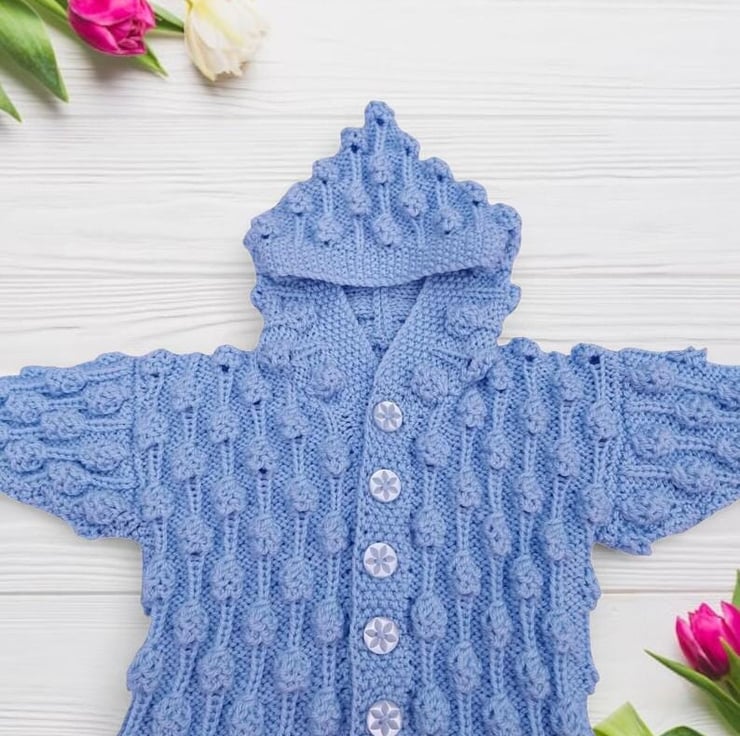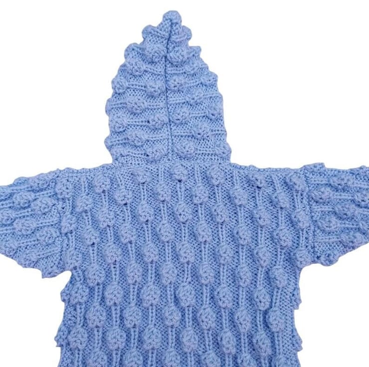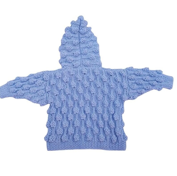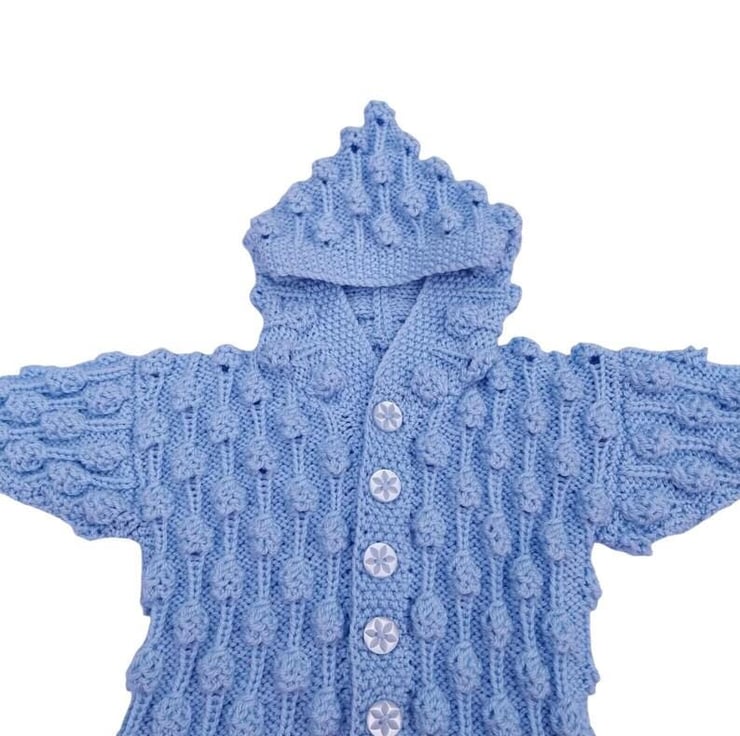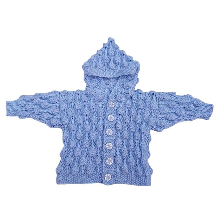 This baby hooded cardigan is hand-knitted in a lovely light blue yarn, featuring an adorable all-over bobble pattern for a playful touch. Fastened with charming baby blue star buttons, this cardigan is both stylish and practical, keeping your little one cosy and cute. Machine washable for easy care, it's a must-have addition to your baby's wardrobe.