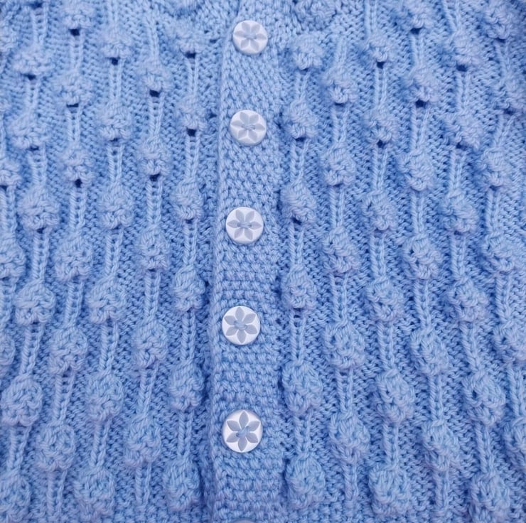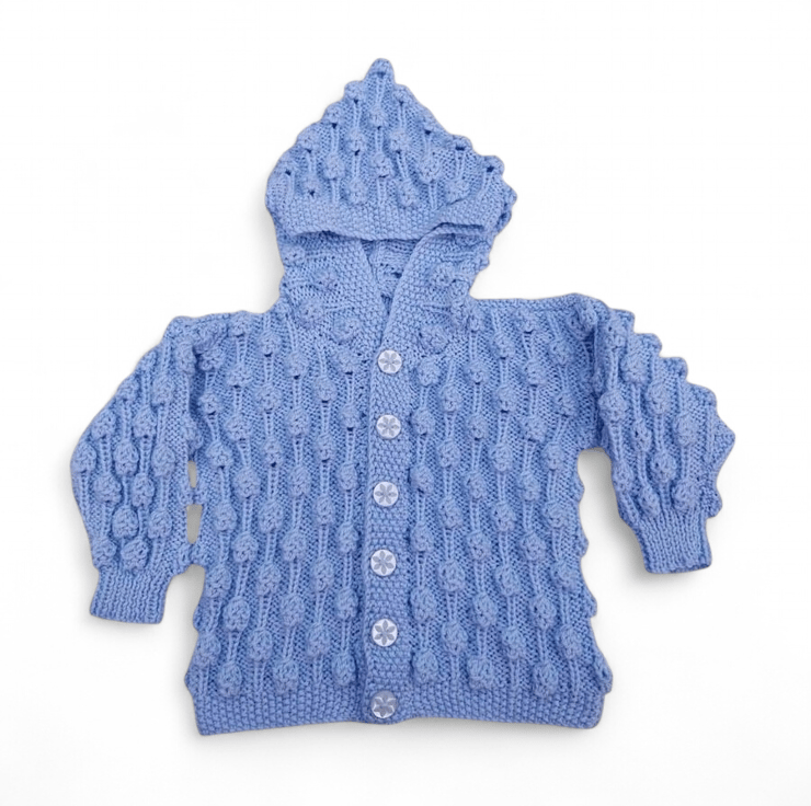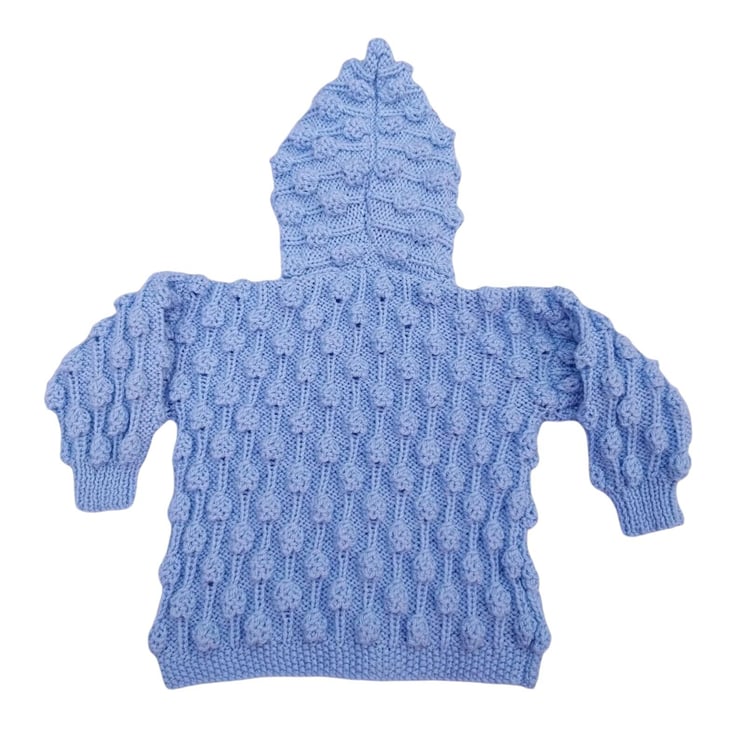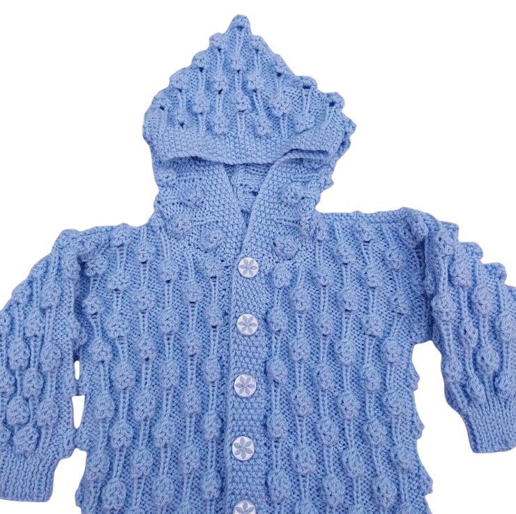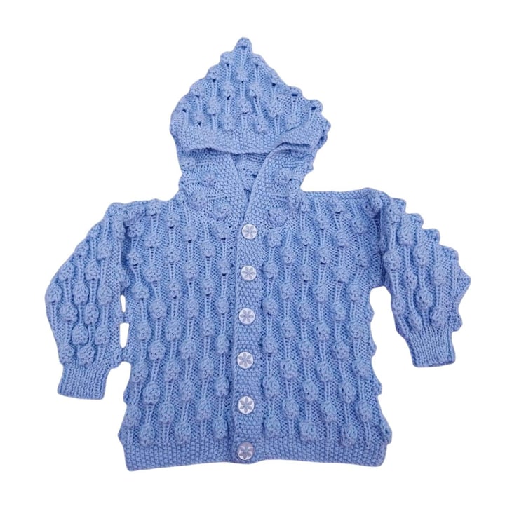 Baby cardigan in blue with hood and bobble pattern to fit 6 - 12 months