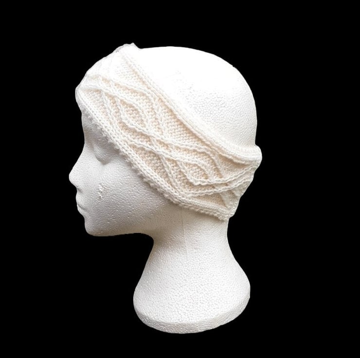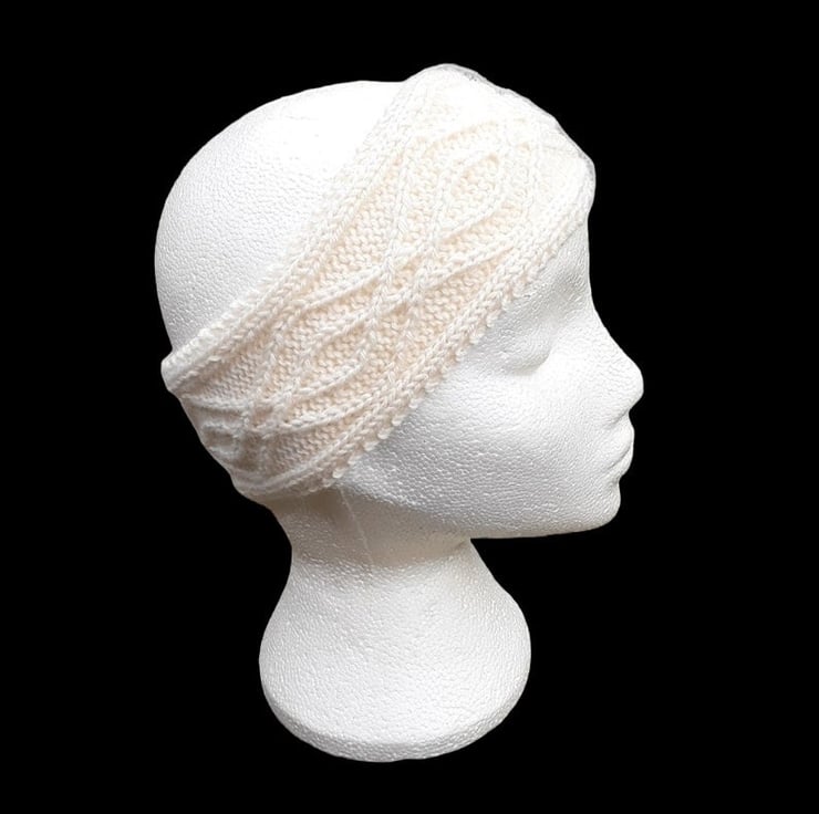 Handcrafted with meticulous care, this earwarmer features two tramline cables gracefully intertwining to create a mesmerizing diamond pattern that adorns its circumference. The cream color radiates timeless grace, ensuring this headband complements any ensemble with versatility.